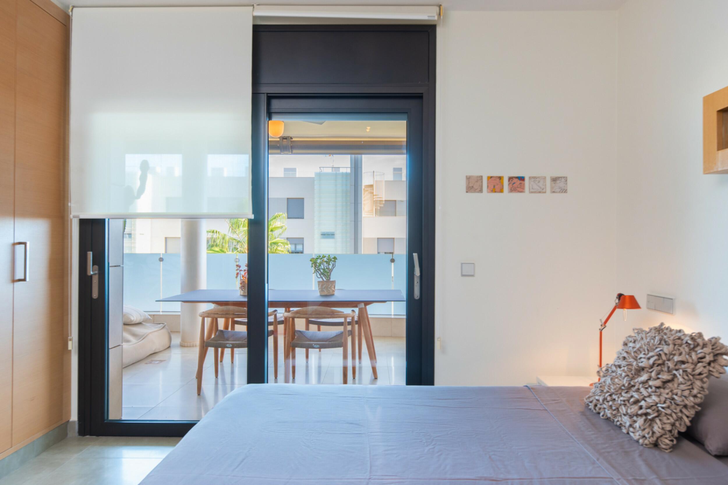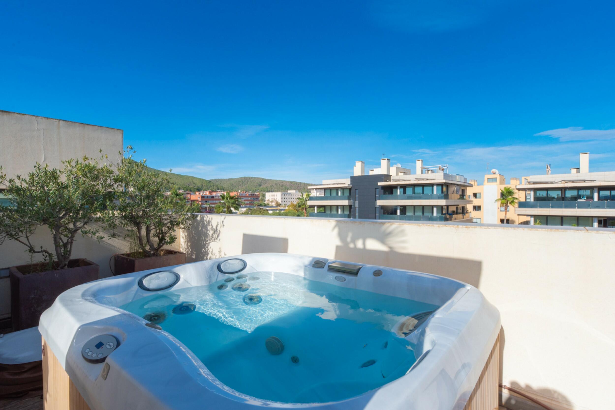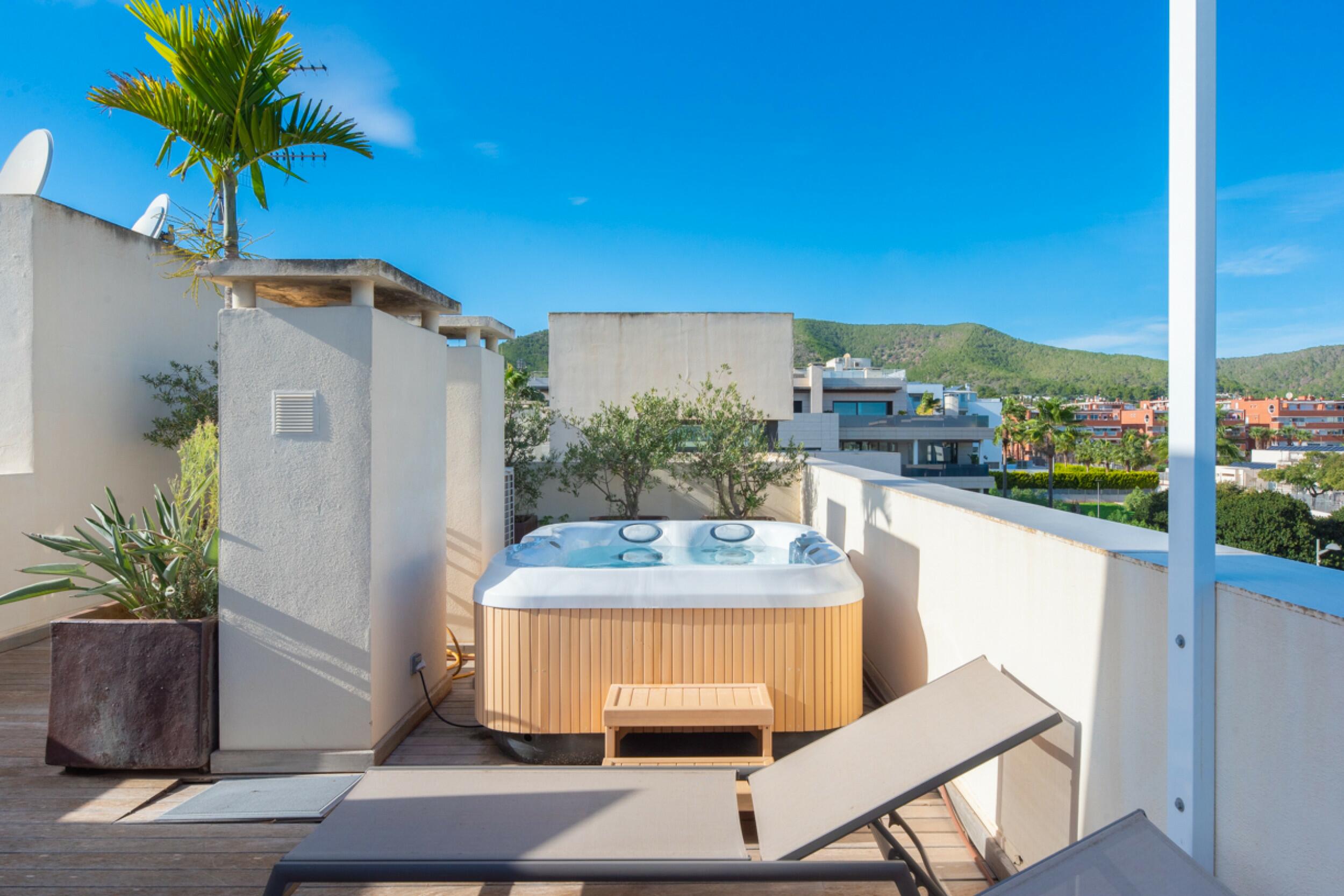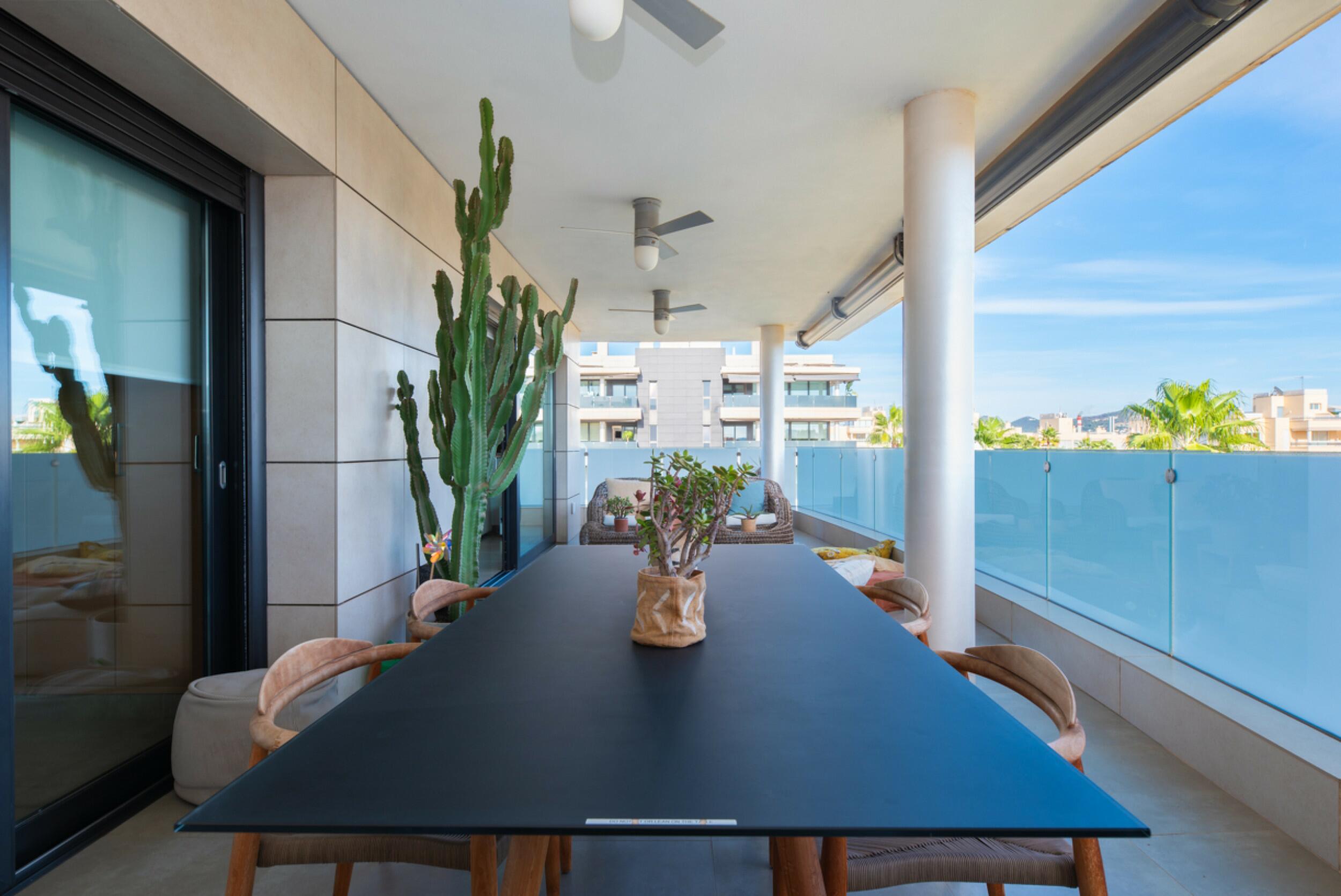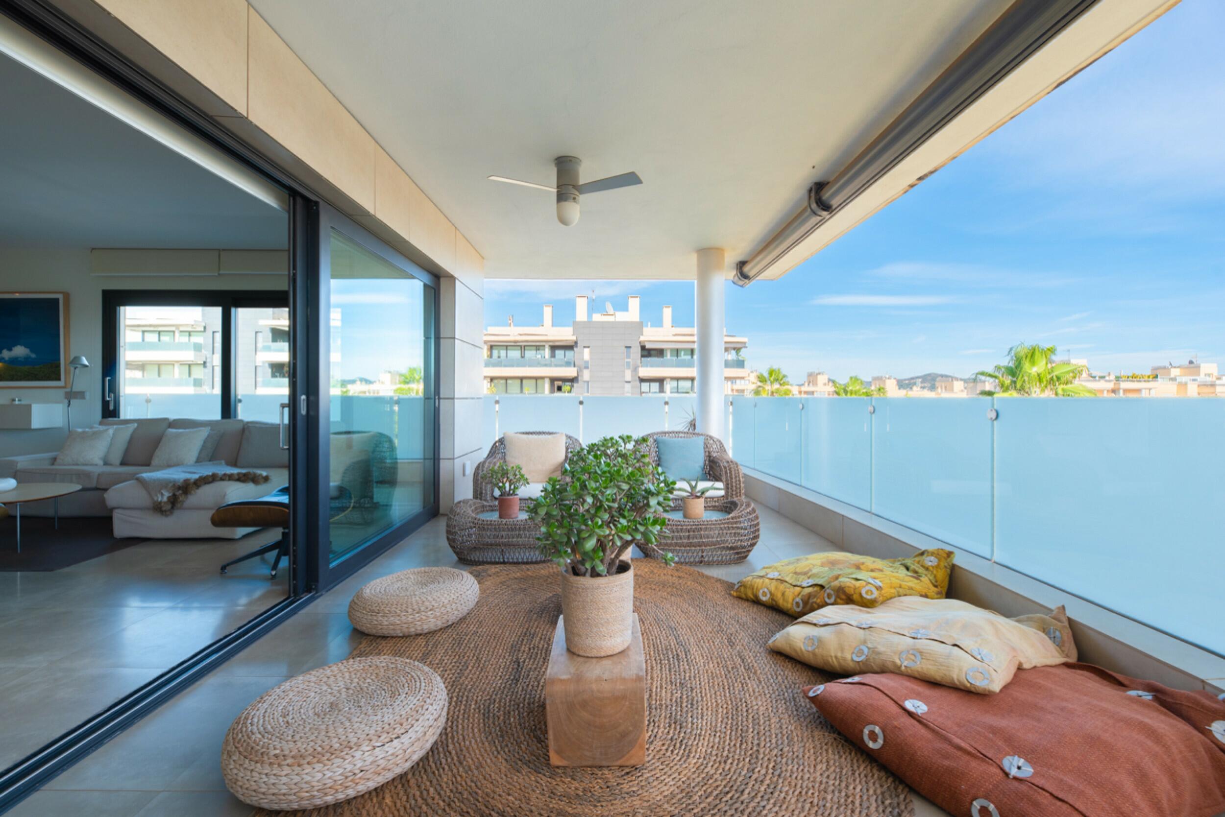 El balcón de la sala de estar conduce a la azotea privada, un espacio exclusivo que ofrece impresionantes vistas de Dalt Vila. Esta azotea cuenta con una zona cubierta, un comedor al aire libre y un relajante espacio chill-out, ideal para disfrutar de la vida al aire libre.