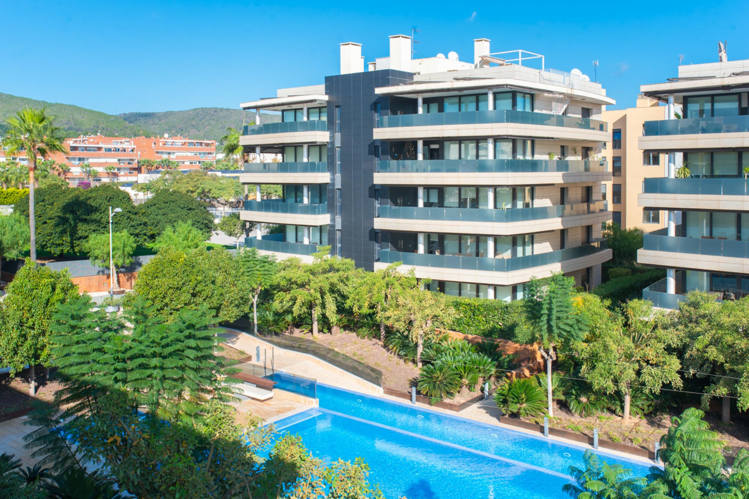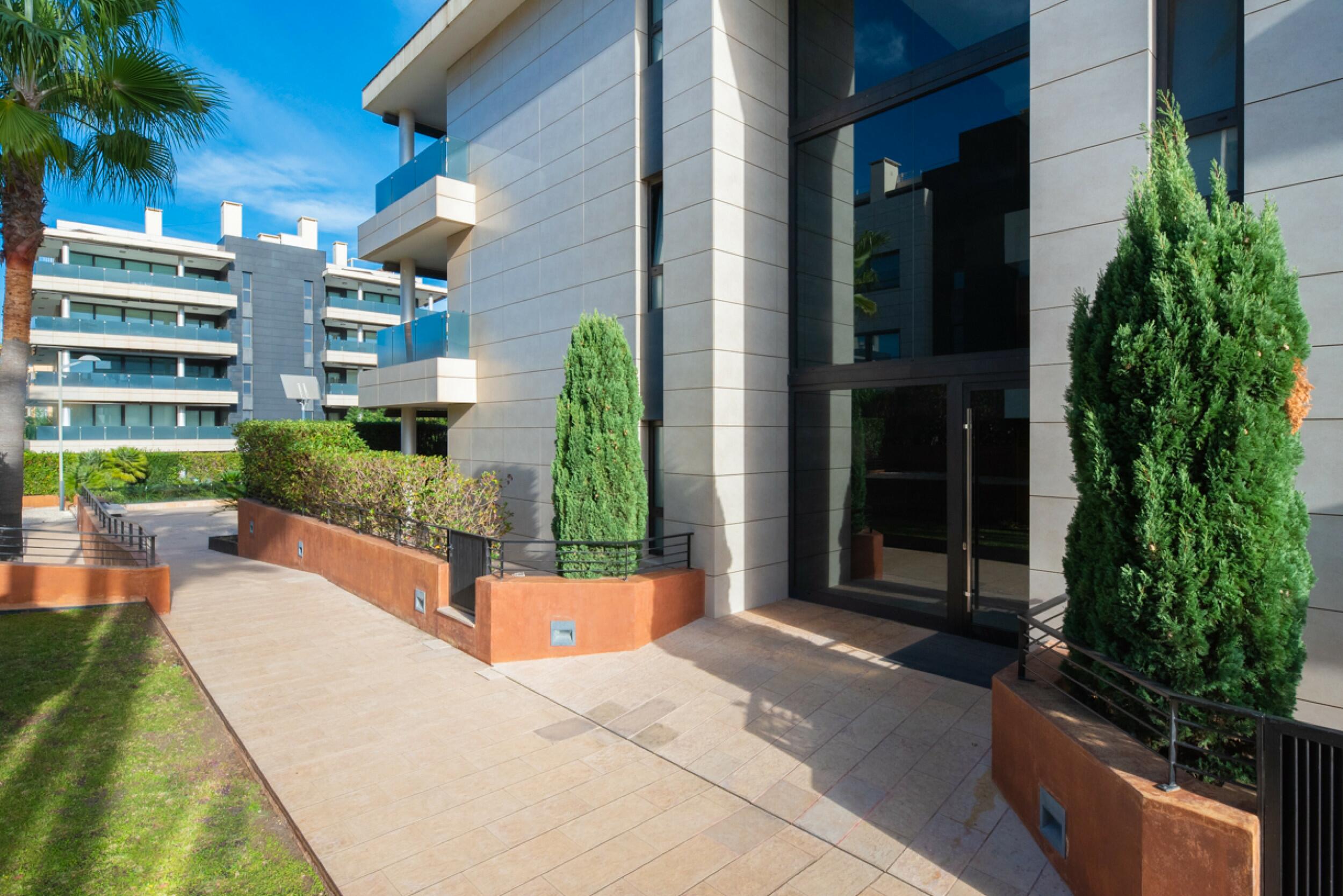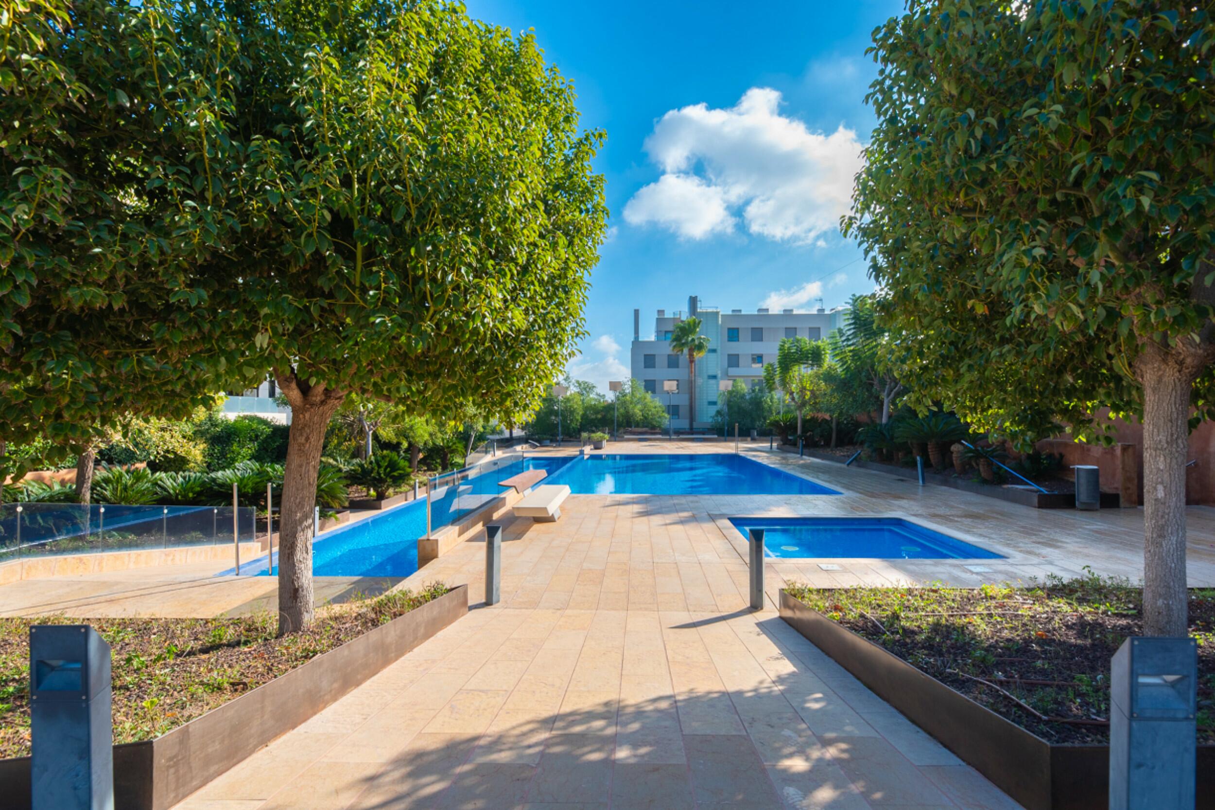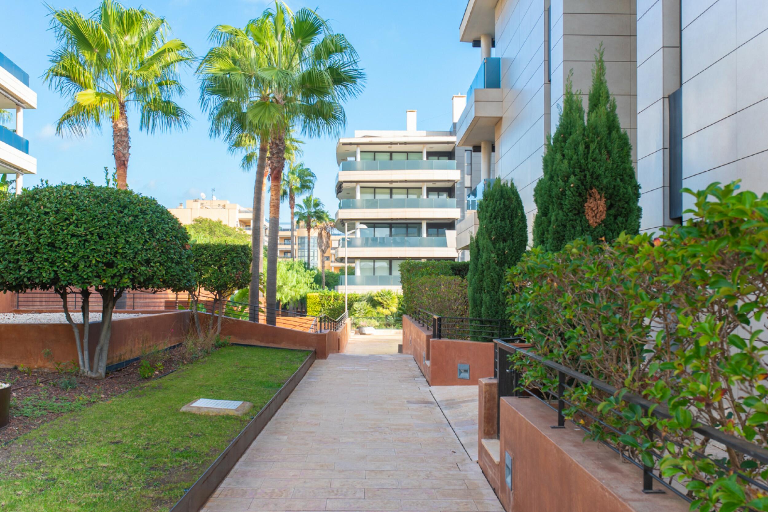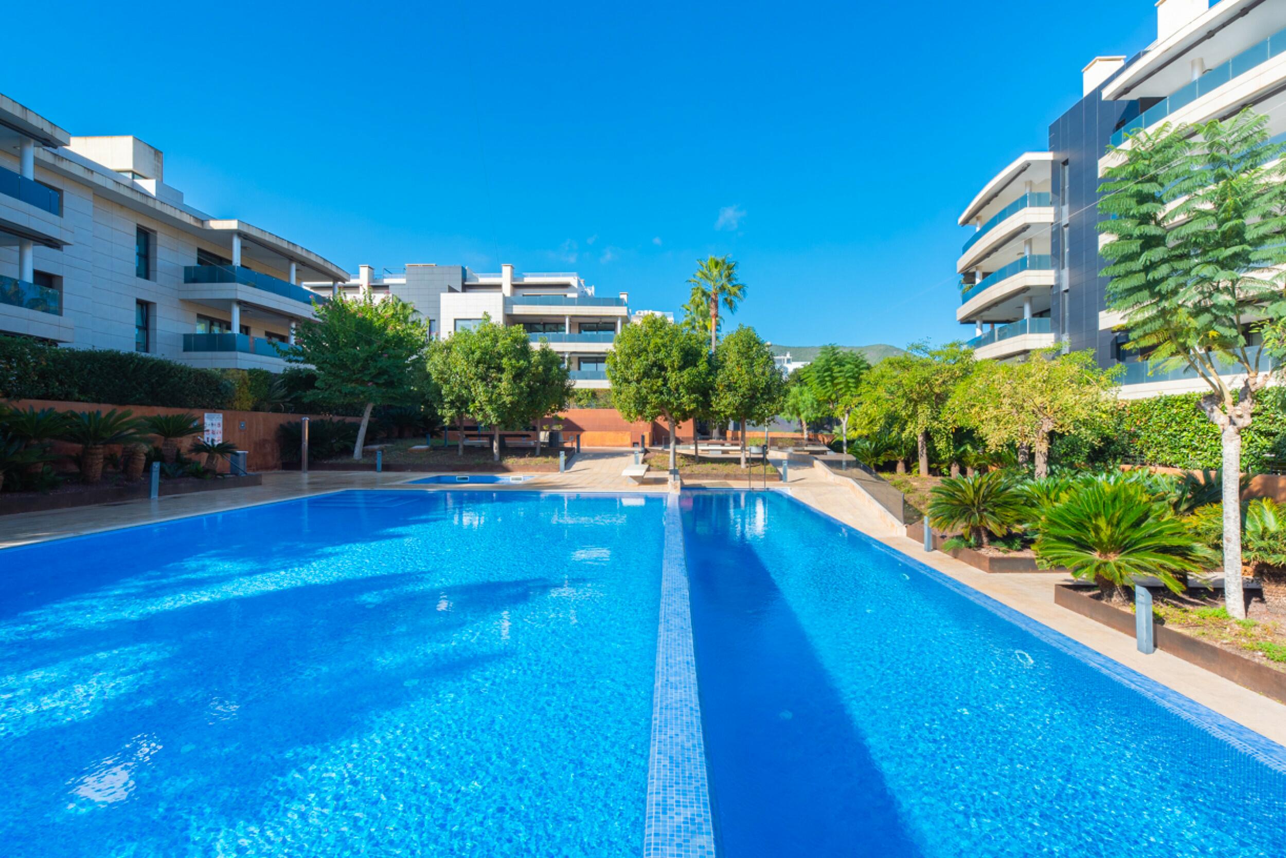 El apartamento ofrece generosos espacios exteriores, incluyendo una amplia terraza con iluminación integrada, equipada con una mesa de comedor para seis personas y un confortable espacio lounge, perfecto para disfrutar en familia o con amigos. Las áreas comunes incluyen jardines exuberantes cuidadosamente mantenidos con plantas y árboles maduros para un ambiente relajante, así como tres piscinas: una gran piscina de 15 x 8 metros, una piscina para niños y una piscina de 25 metros con corriente de nado.