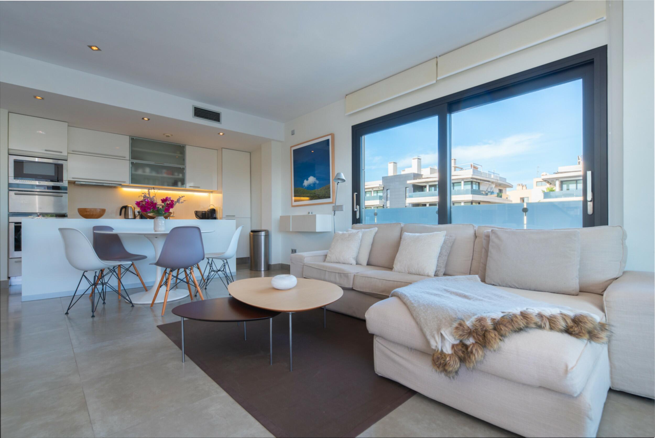 Exclusivamente disponible con Prestige Properties, «Apartmento Nova" es un elegante apartamento moderno de dos dormitorios ubicado en una comunidad apreciada de Can Misses, Ibiza. Esta sofisticada residencia combina un estilo de vida urbano refinado con amplios espacios exteriores y servicios comunes de primer nivel, incluyendo un servicio de conserjería diario para una tranquilidad y comodidad óptimas.