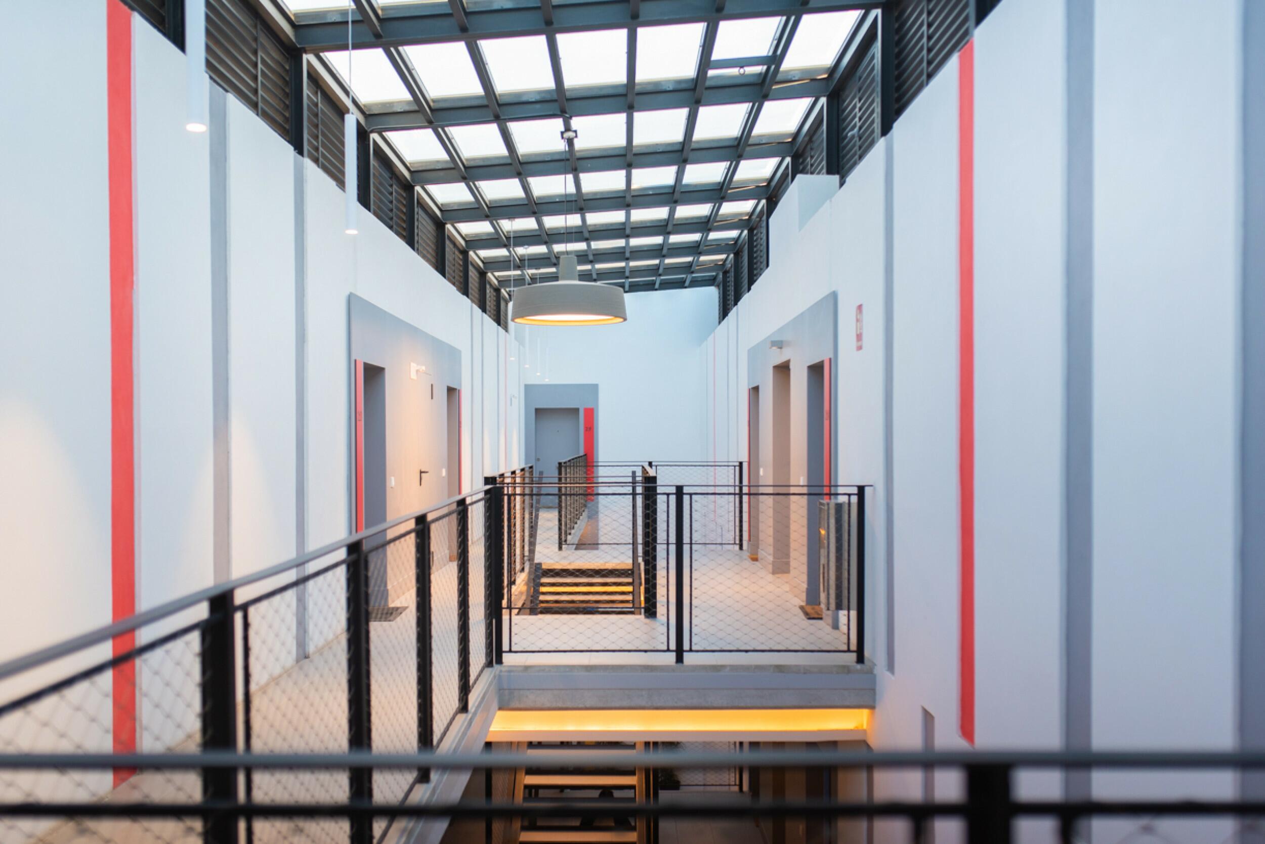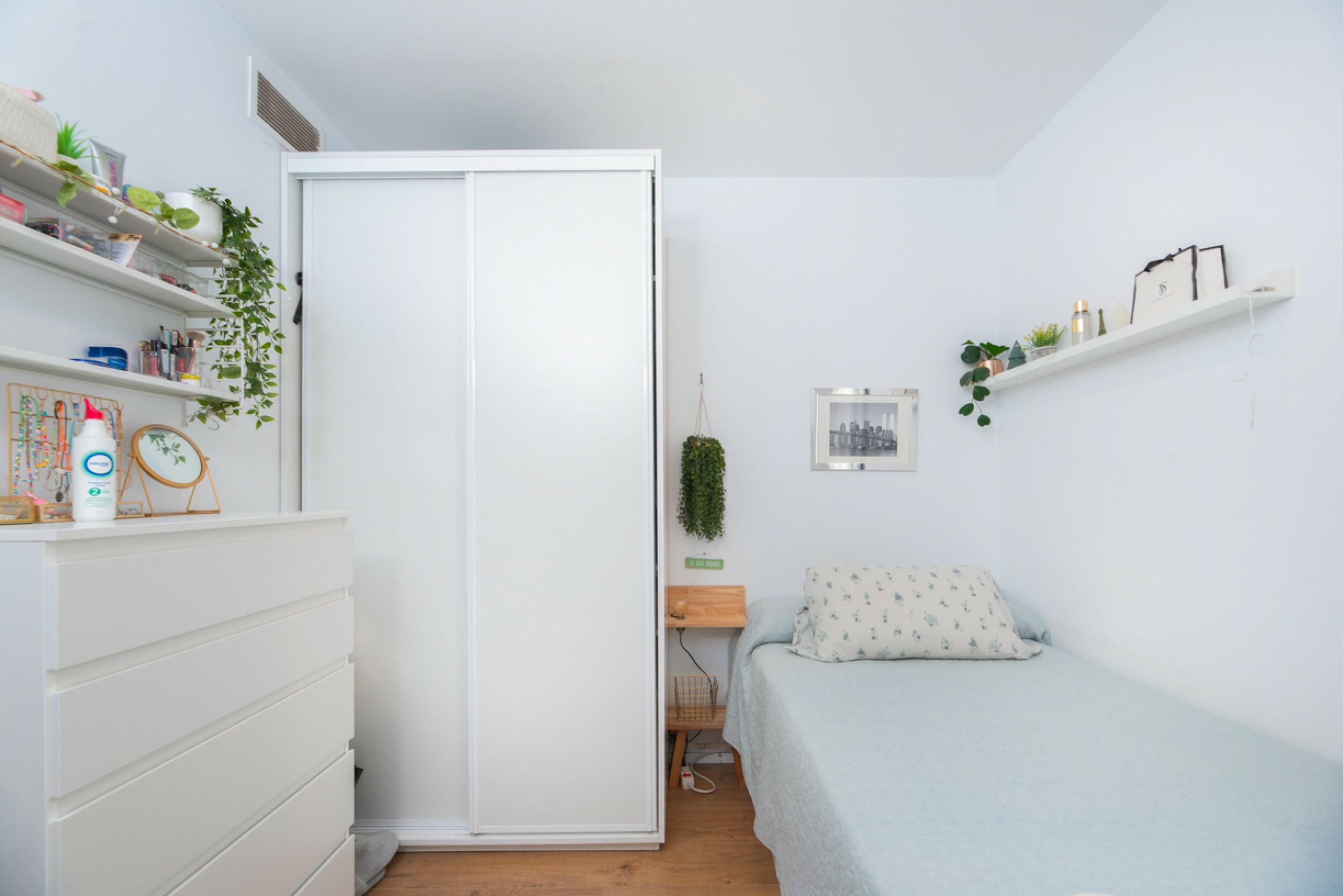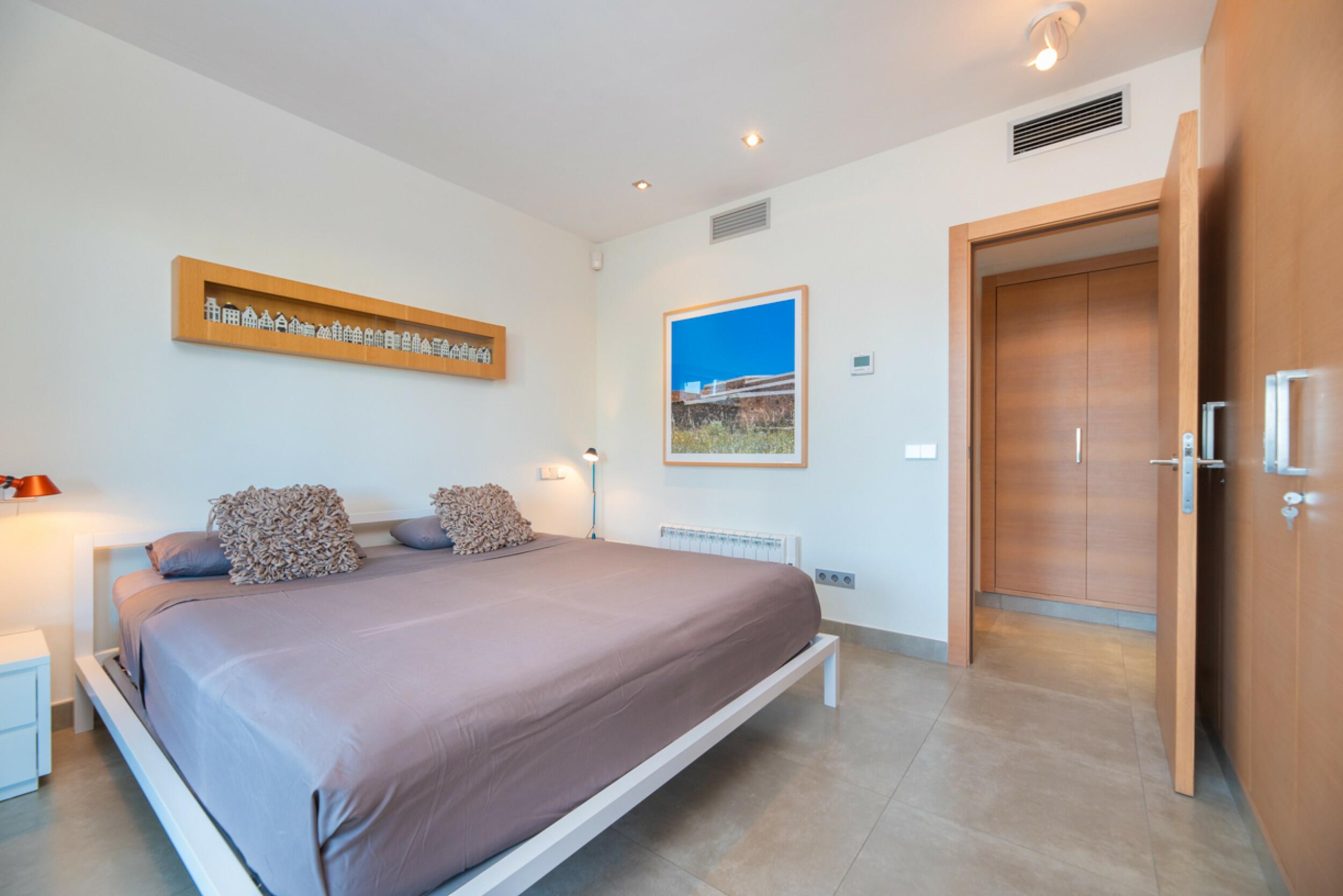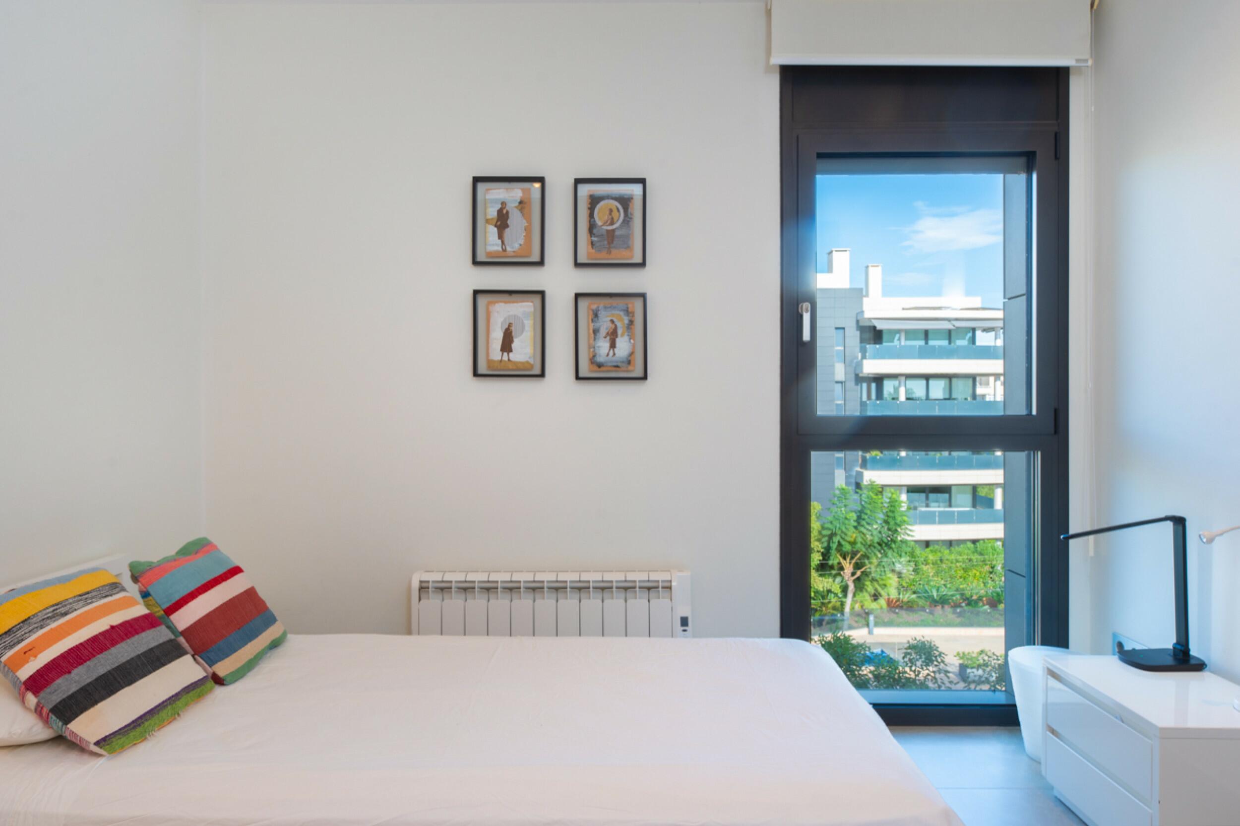Un pasillo central conduce a los dormitorios: uno individual y otro doble, que comparten un cuarto de baño con bañera. Al final del pasillo se encuentra el dormitorio principal, con su propio balcón, un baño en suite y armarios empotrados.
