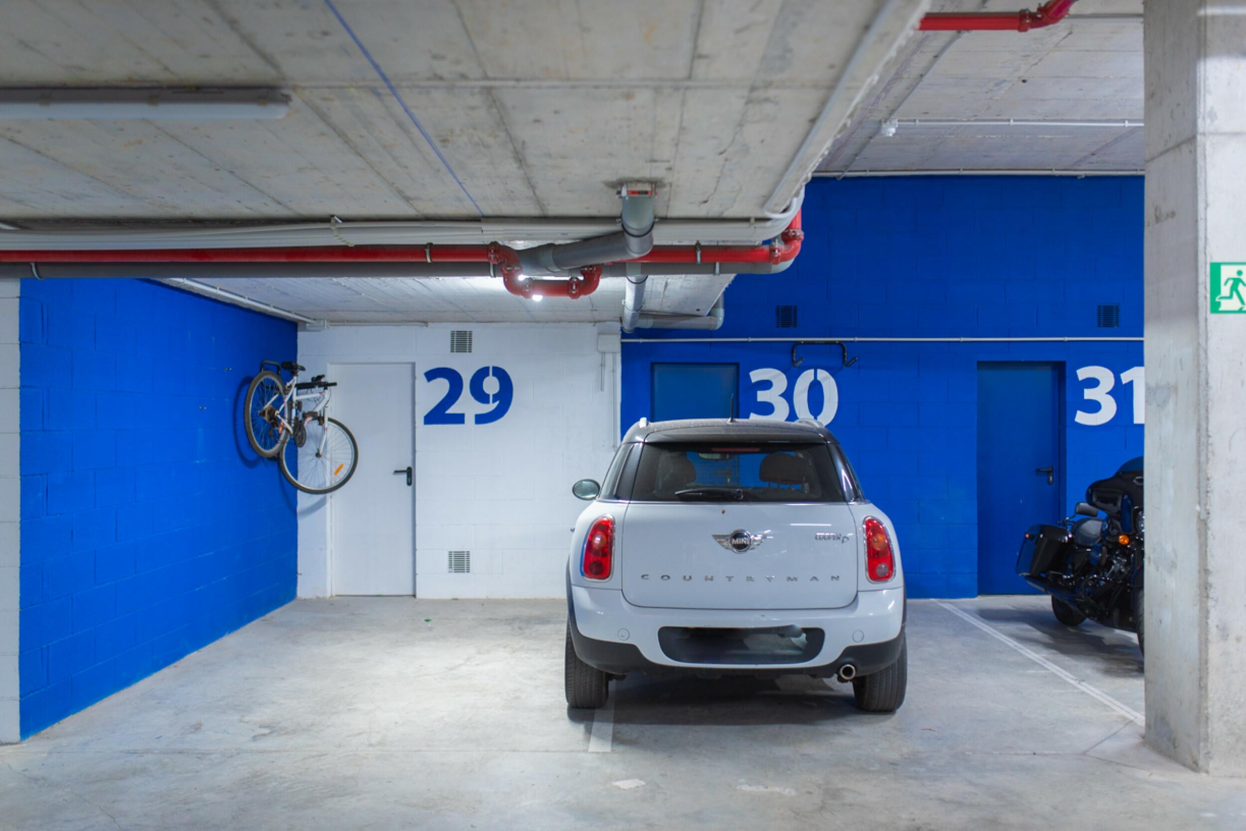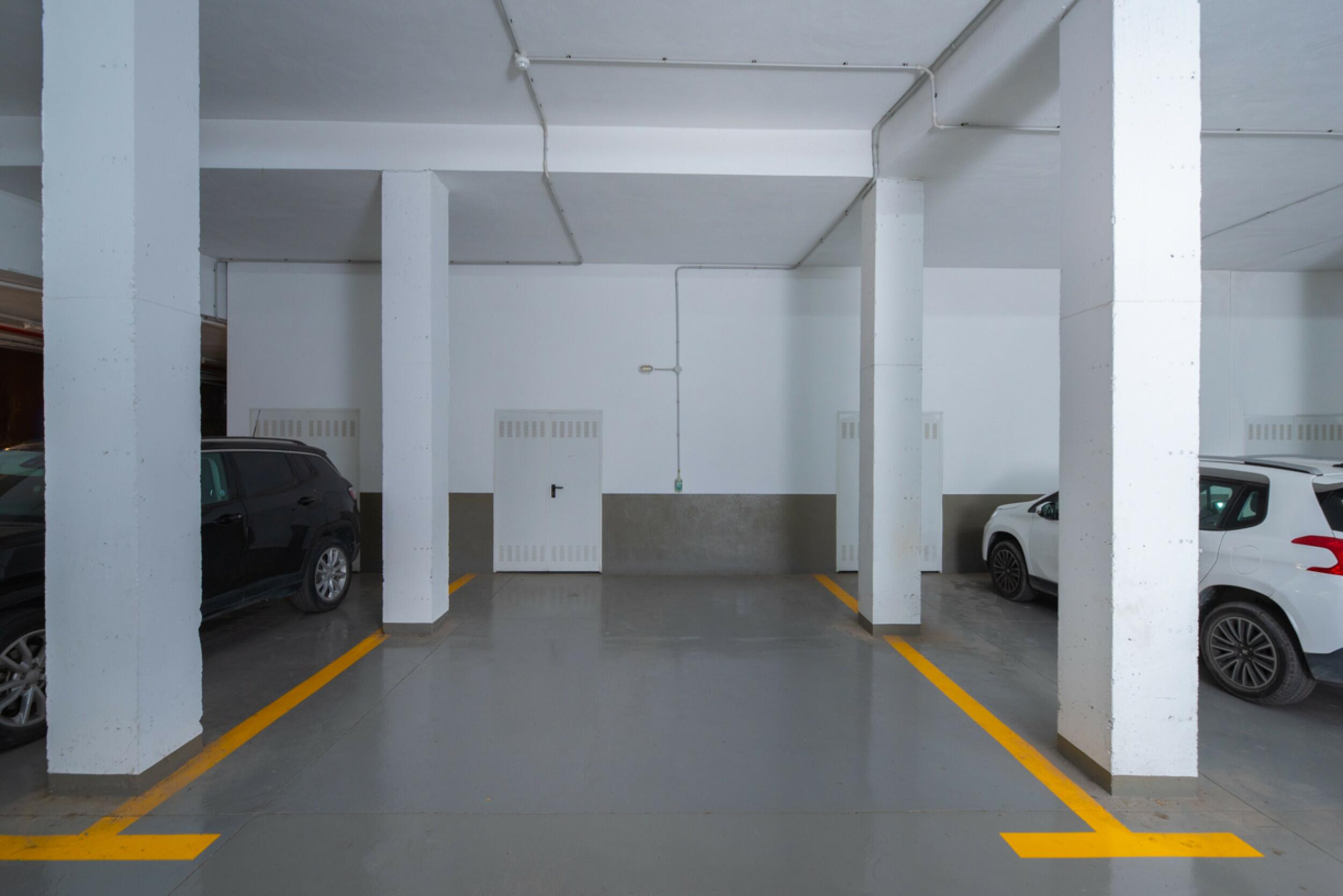 La comunidad ofrece acceso seguro a través de una entrada cerrada. Al llegar, encontrará un cómodo aparcamiento subterráneo con dos plazas privadas. Además, dispone de dos trasteros, cada uno de 5 m², situados justo frente a la zona de aparcamiento. Desde allí, puede tomar el ascensor directamente hasta la propiedad, ubicada en el segundo piso.