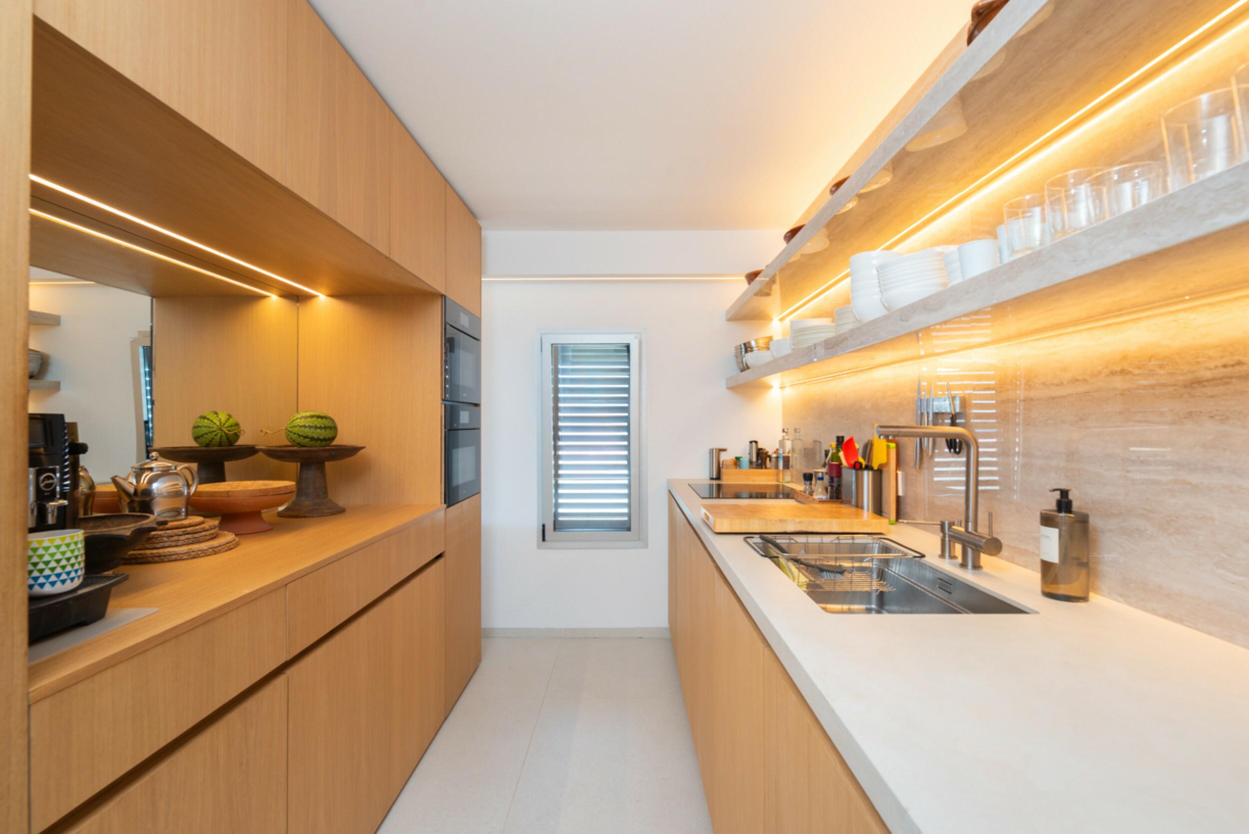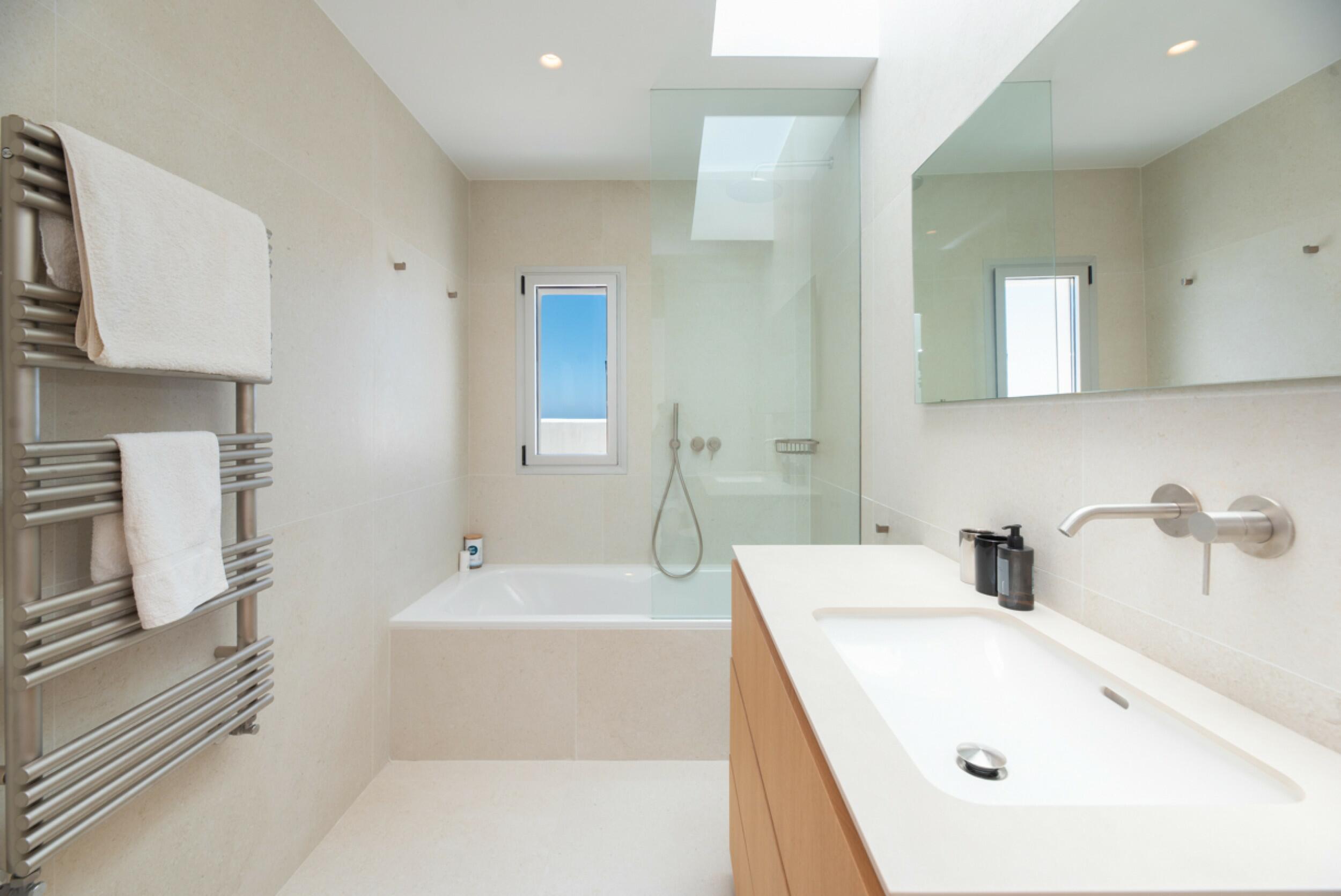 A lo largo del paseo principal hay un largo tramo de arena blanca y la playa principal de la ciudad de San Antonio. Esta playa central de 6 km de largo conduce a un hermoso puerto deportivo y está perfectamente ubicado para cualquiera que busque comprar o alquilar una villa (o apartamento) en la ciudad de San Antonio por lo que la distancia a pie local es un requisito final.