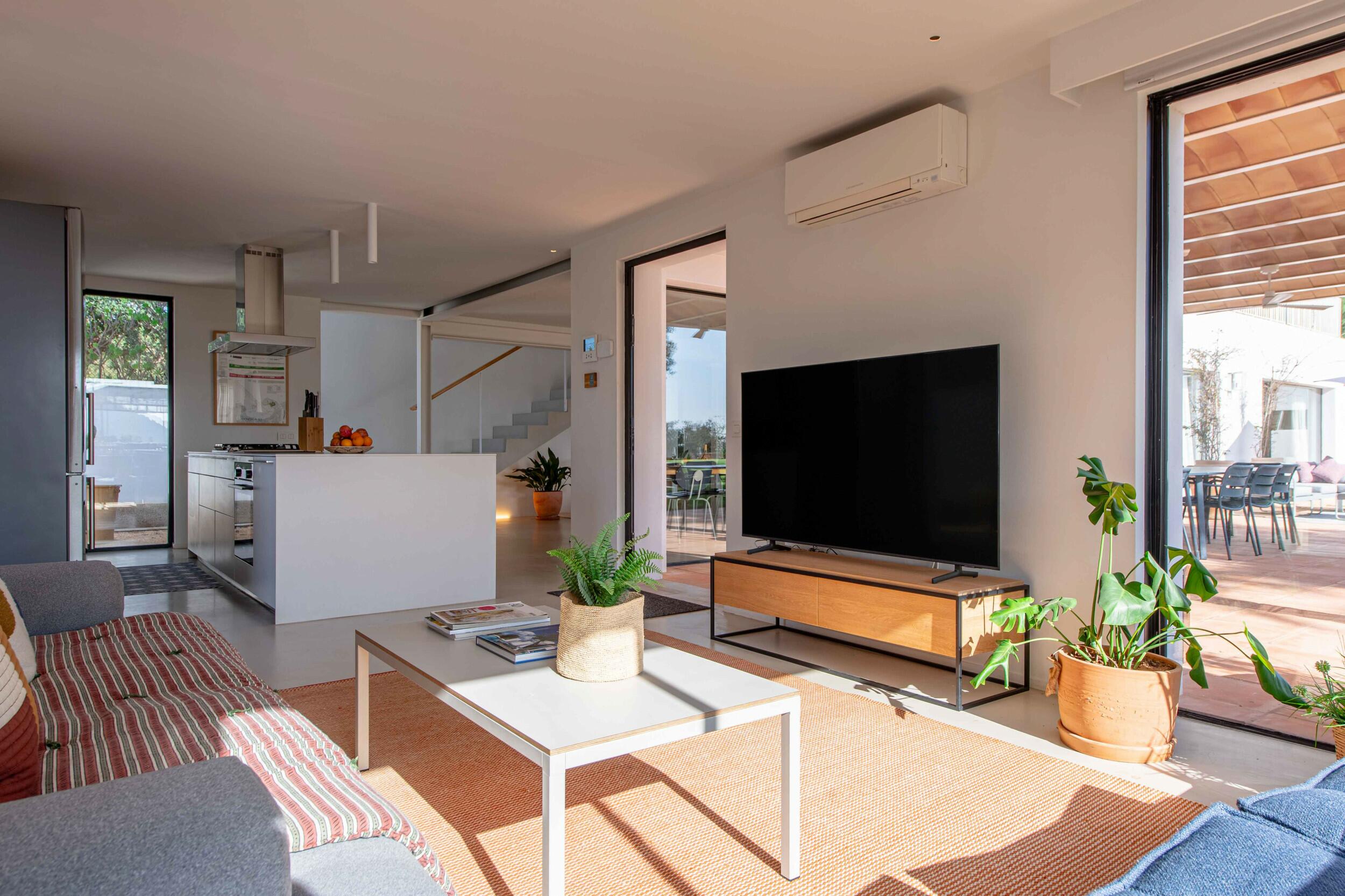 En la planta baja, una luminosa sala de estar fluye sin esfuerzo hacia la terraza, mientras que el comedor para diez personas se abre directamente al exterior, creando un estilo de vida interior-exterior sin esfuerzo. Una cocina totalmente equipada, un cuarto de lavandería separado con lavadora y secadora, y una sala de televisión adicional con sofá cama garantizan tanto confort como practicidad.