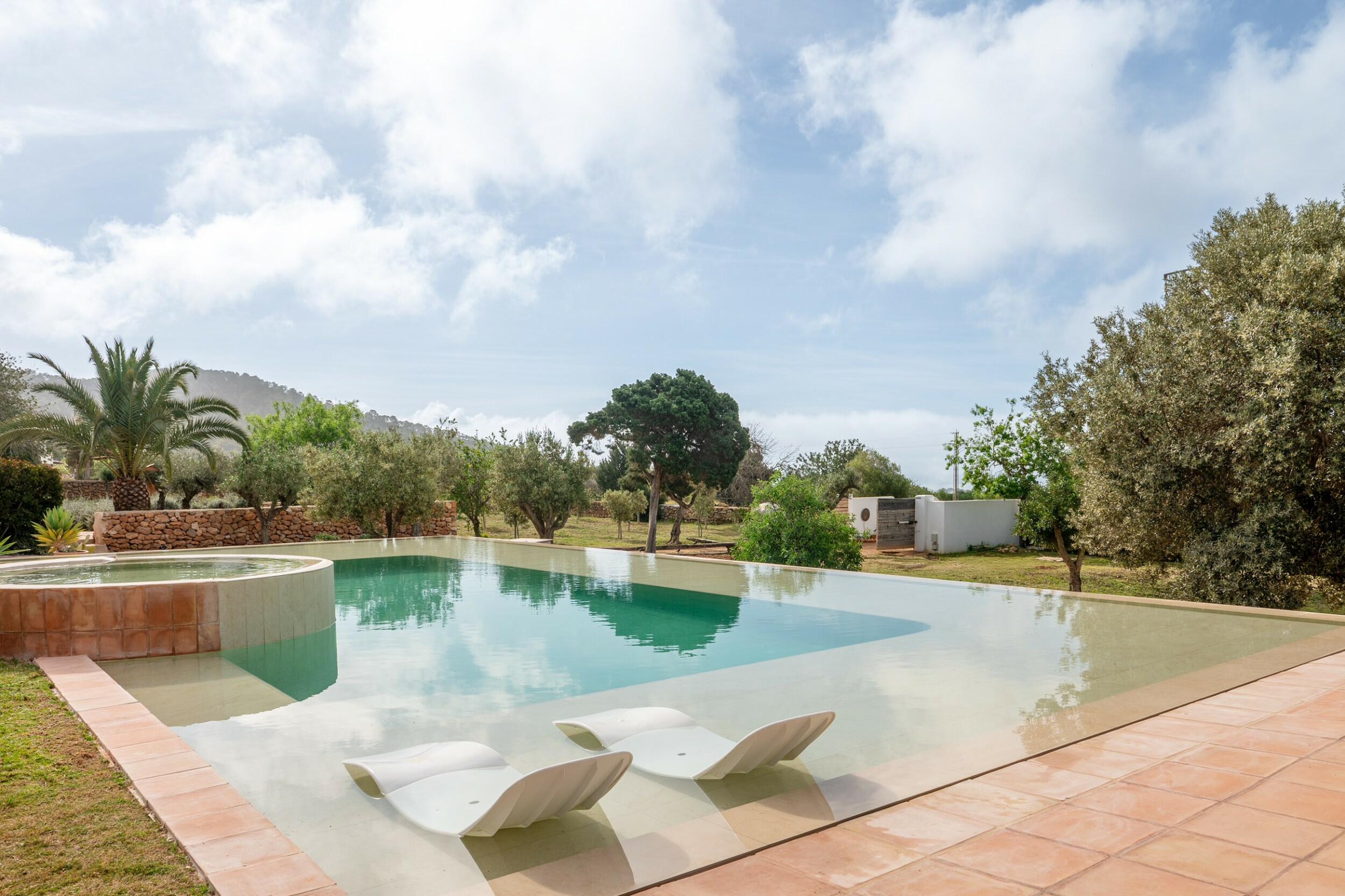 • Piscina desbordante con jacuzzi central y vistas lejanas al mar hacia Formentera