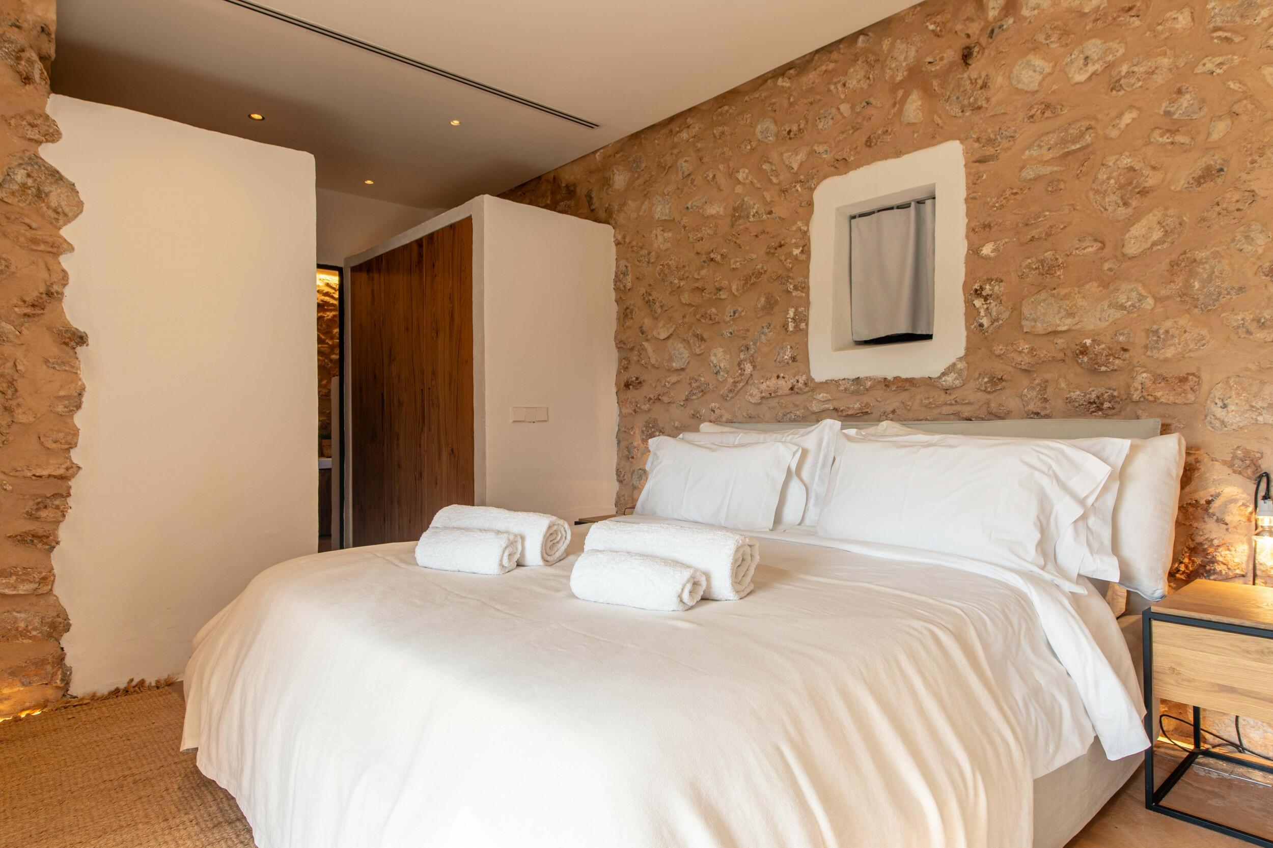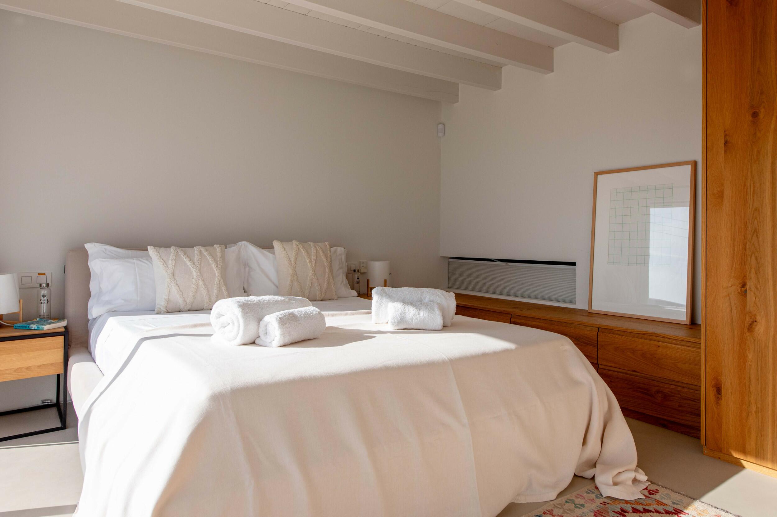 Los puntos destacados cercanos incluyen Cala d’Hort, famosa por sus vistas magnéticas de Es Vedrà al atardecer; el Dalt Vila, declarado Patrimonio de la Humanidad por la UNESCO, un laberinto de encanto histórico y terrazas panorámicas; y el vibrante ambiente de la marina cerca de la ciudad de Ibiza.