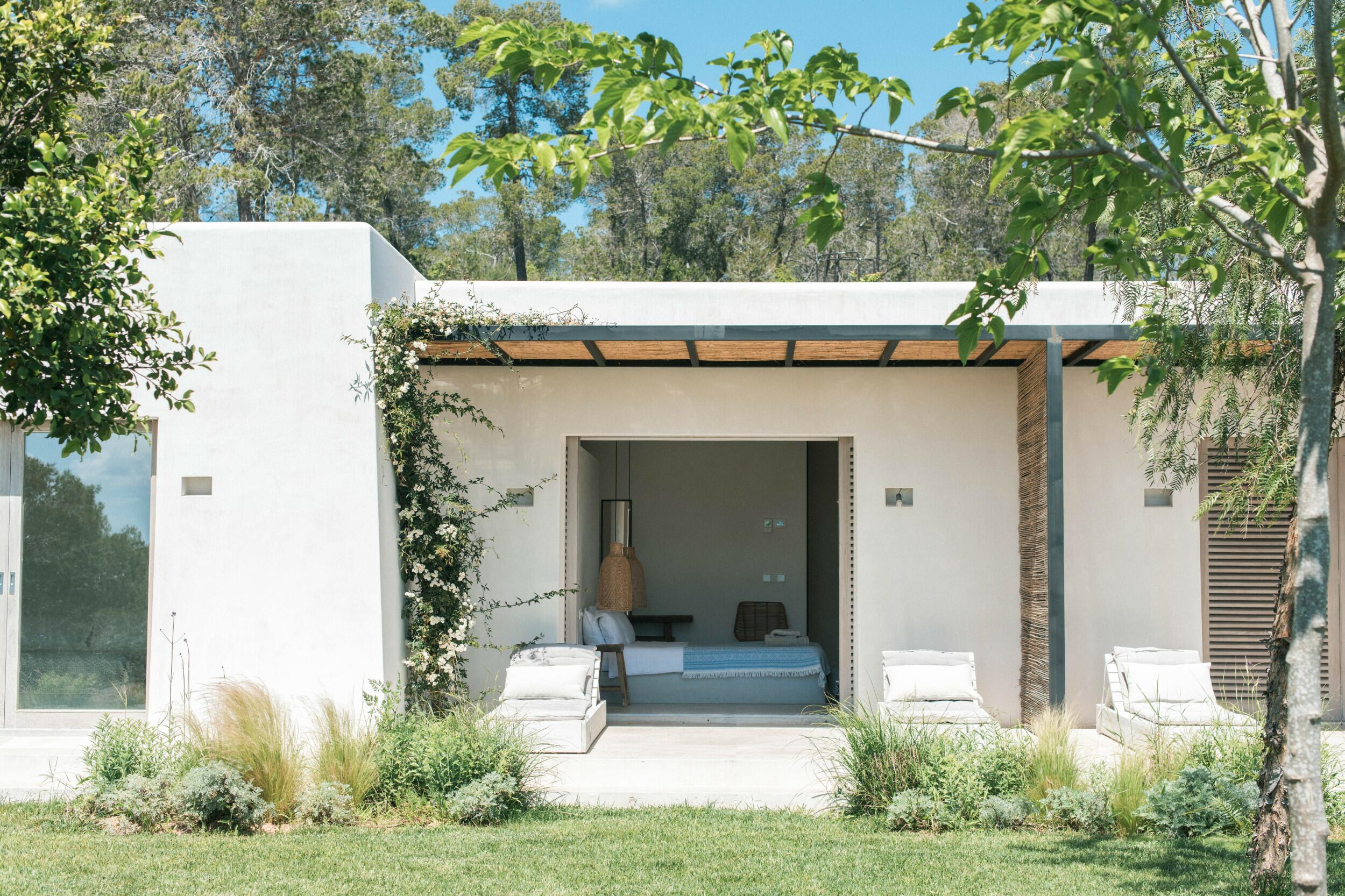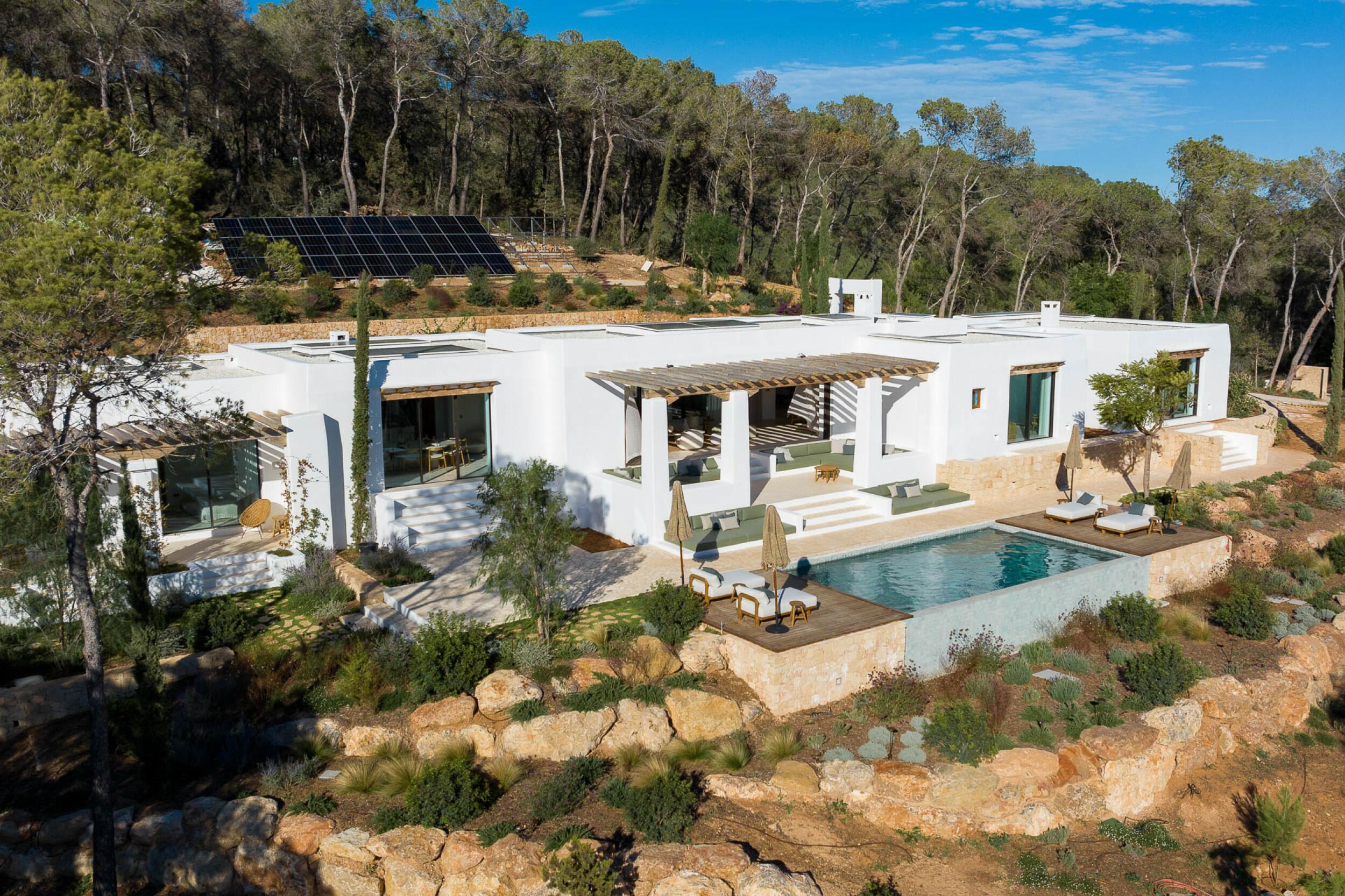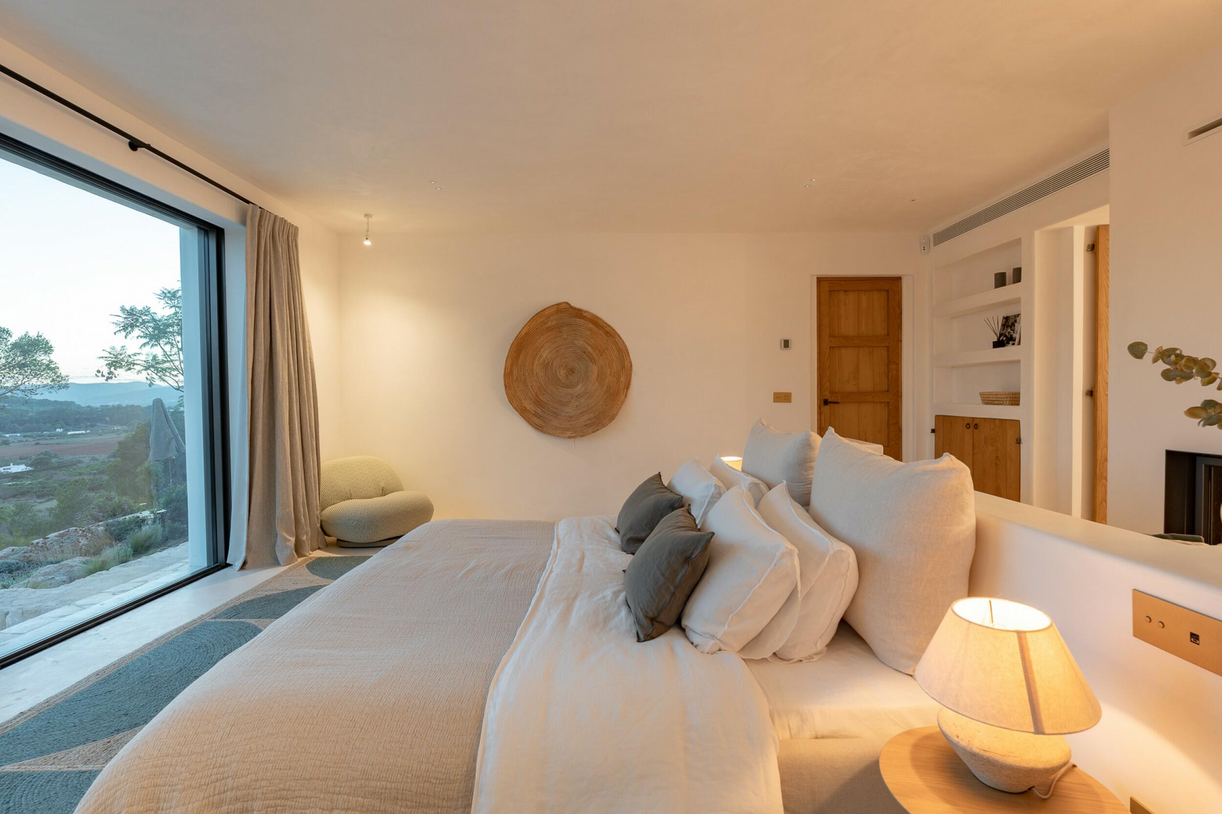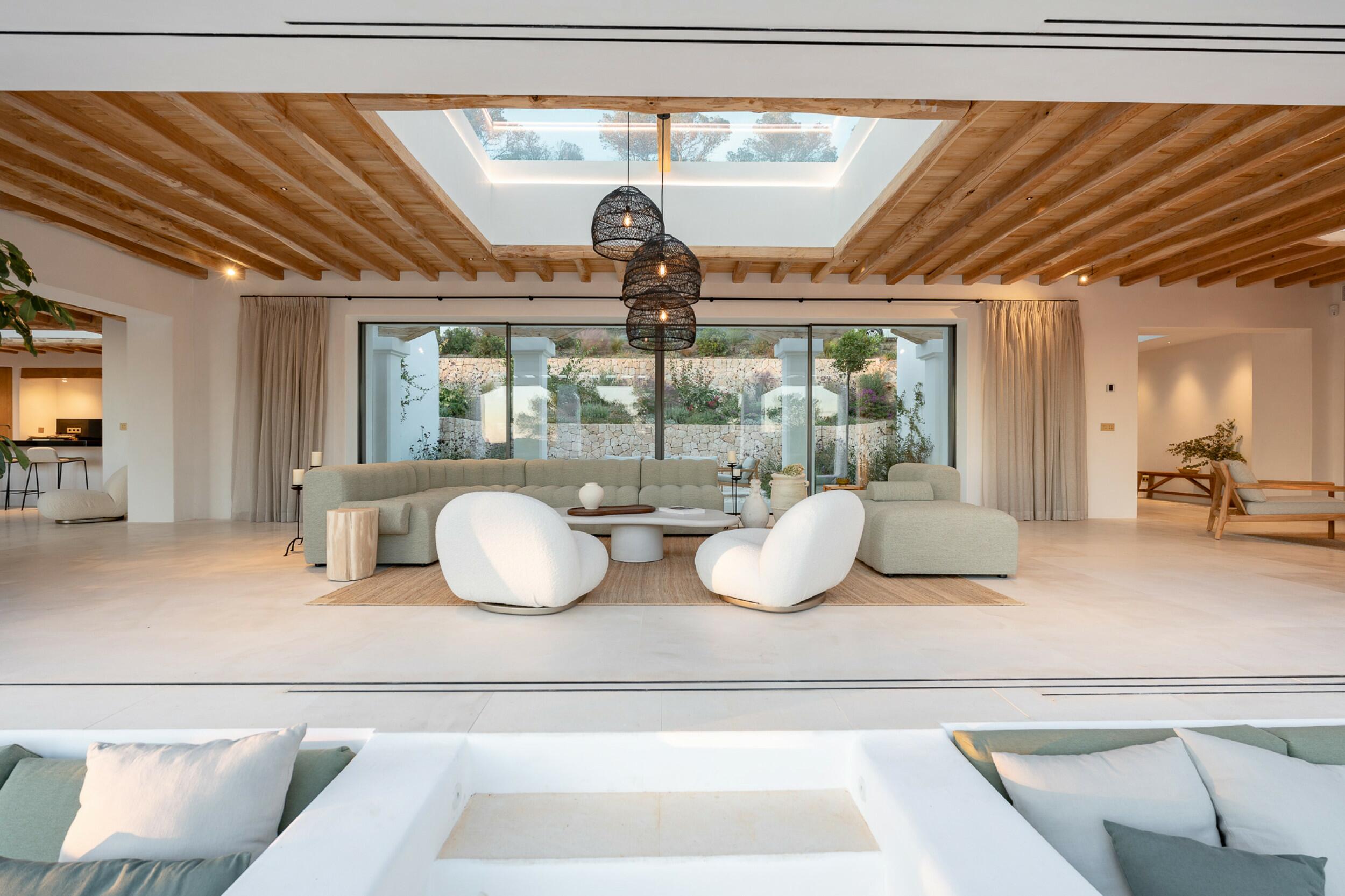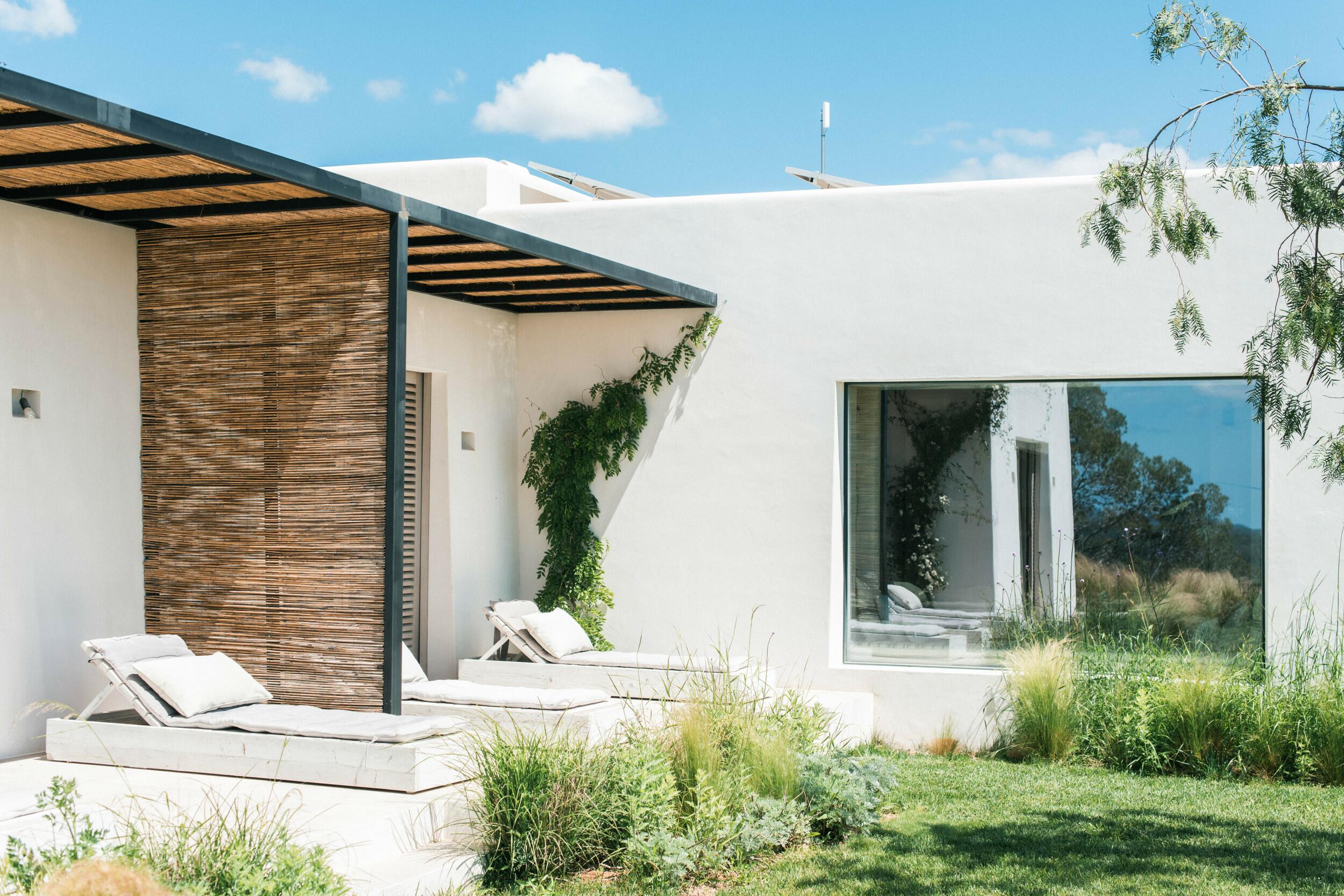 Esta propiedad muy especial, que tiene una superficie total de 32.000 m2 y una casa de 251 m2 tiene una hermosa e imponente fachada blanca de estilo campesino. Tradicionalmente, estas casas fueron construidas por los propios agricultores y ganaderos de Ibiza para vivir junto a sus tierras, y se distinguían por tener pequeñas ventanas de forma cuadrada y líneas curvas en los extremos de los tejados y las paredes.
