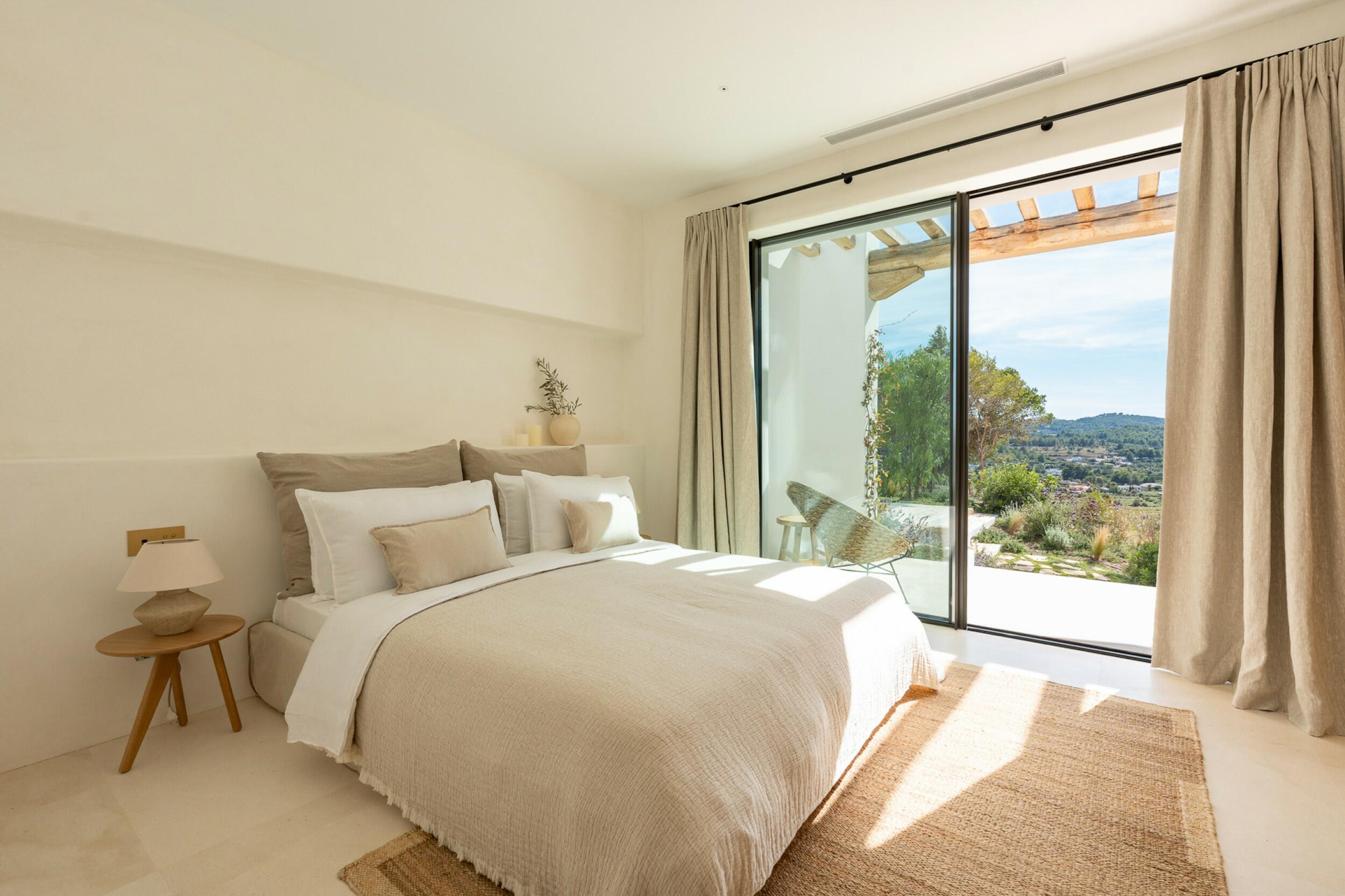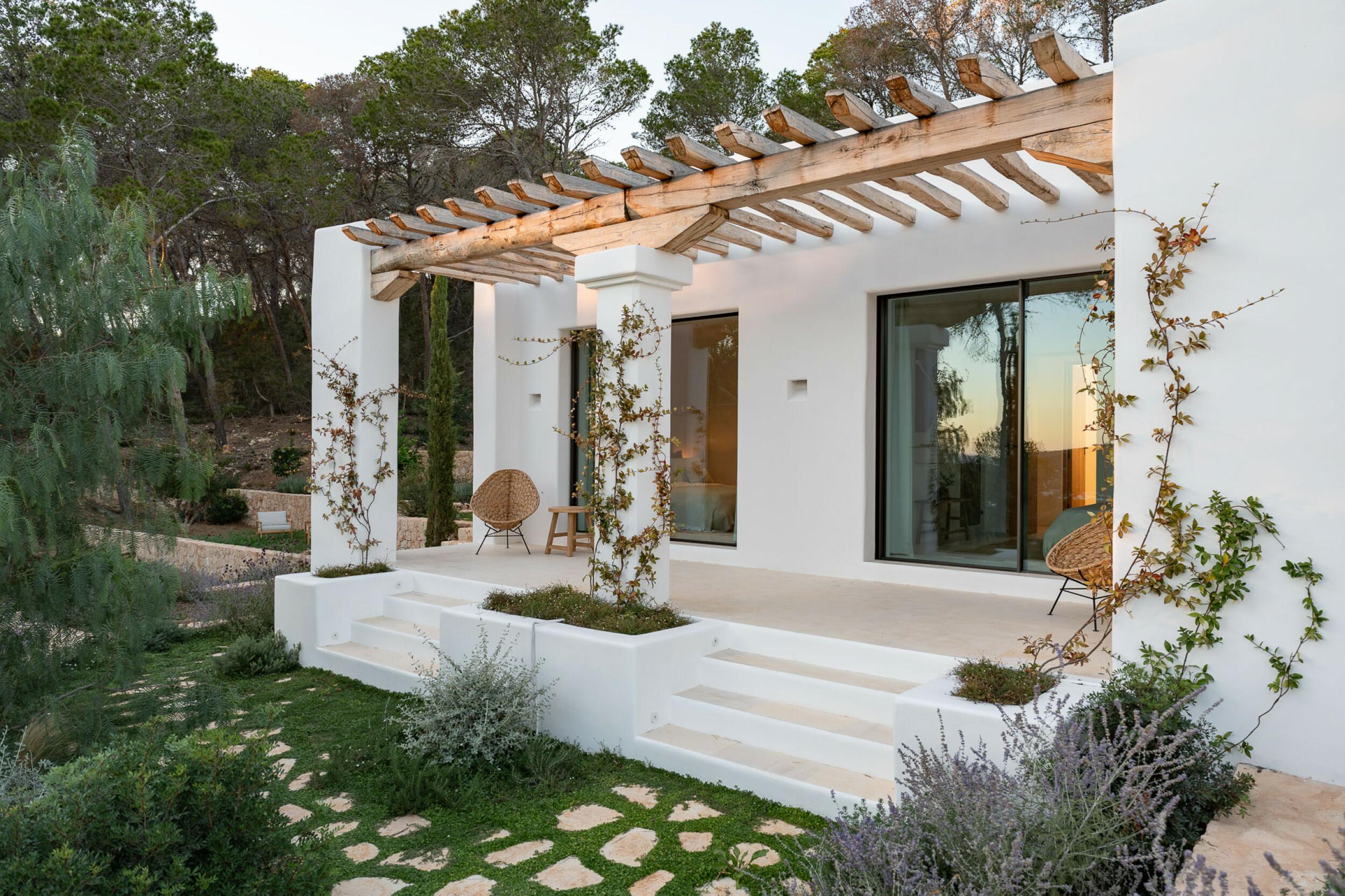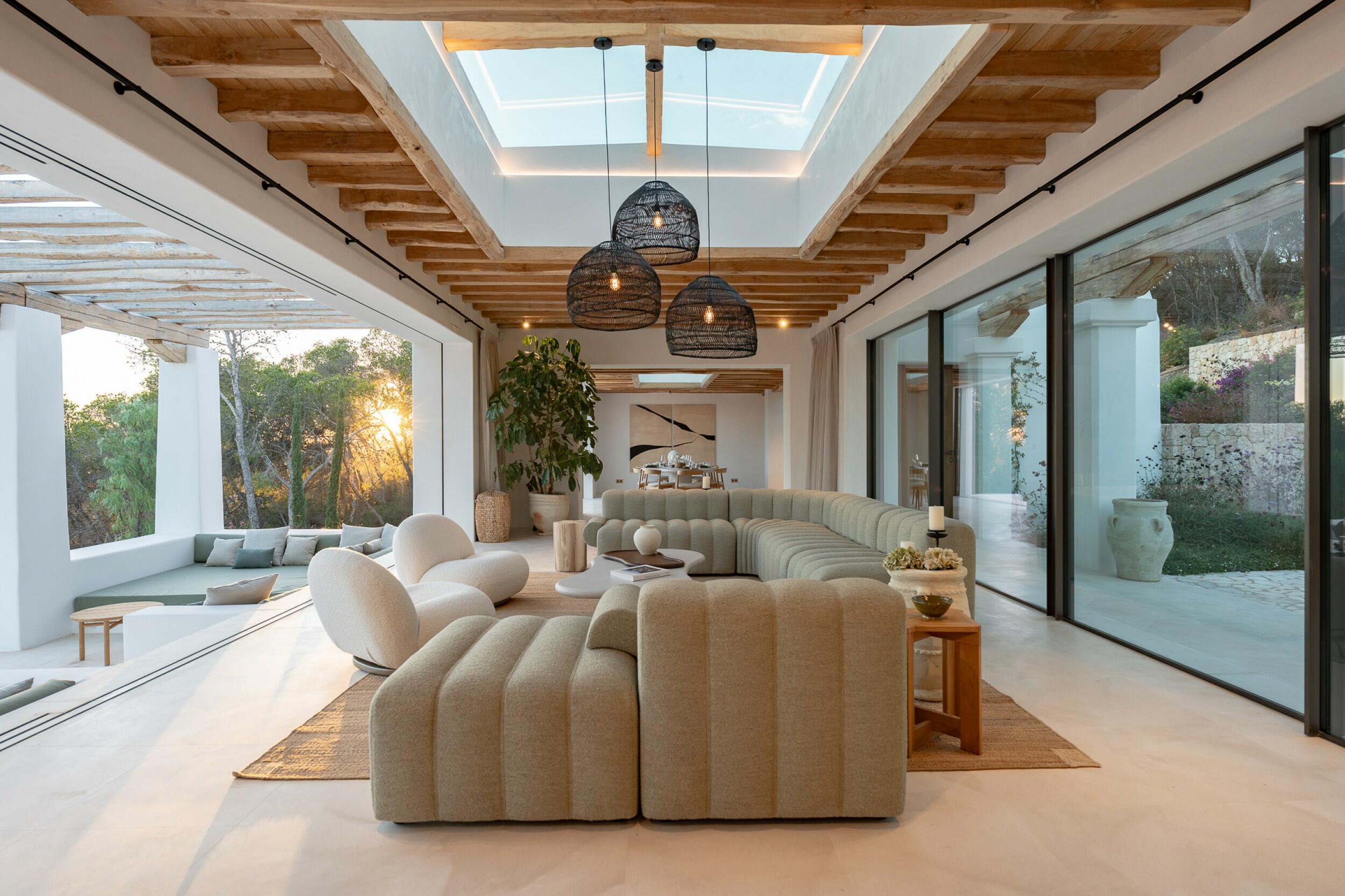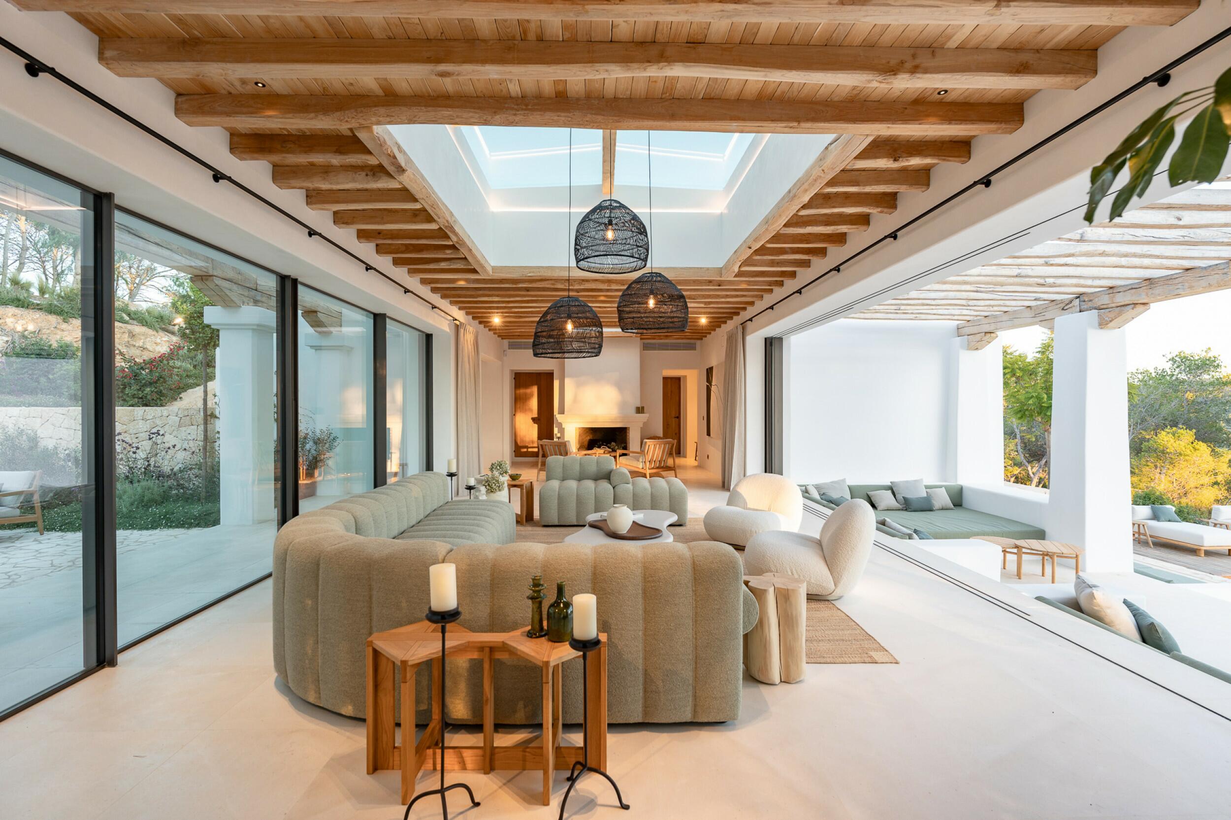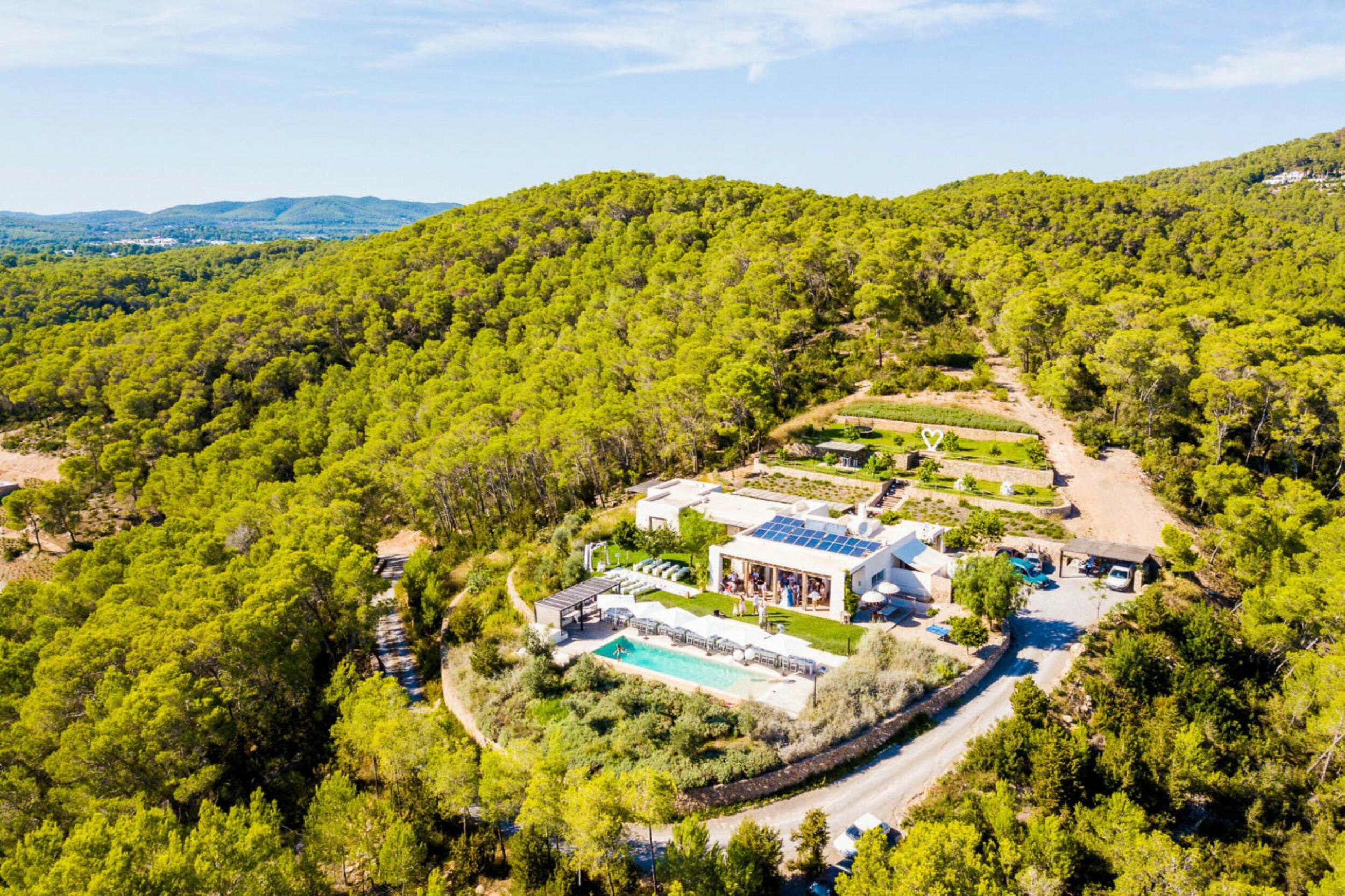 Esta propiedad muy especial, que tiene una superficie total de 32.000 m2 y una casa de 251 m2 tiene una hermosa e imponente fachada blanca de estilo campesino. Tradicionalmente, estas casas fueron construidas por los propios agricultores y ganaderos de Ibiza para vivir junto a sus tierras, y se distinguían por tener pequeñas ventanas de forma cuadrada y líneas curvas en los extremos de los tejados y las paredes.