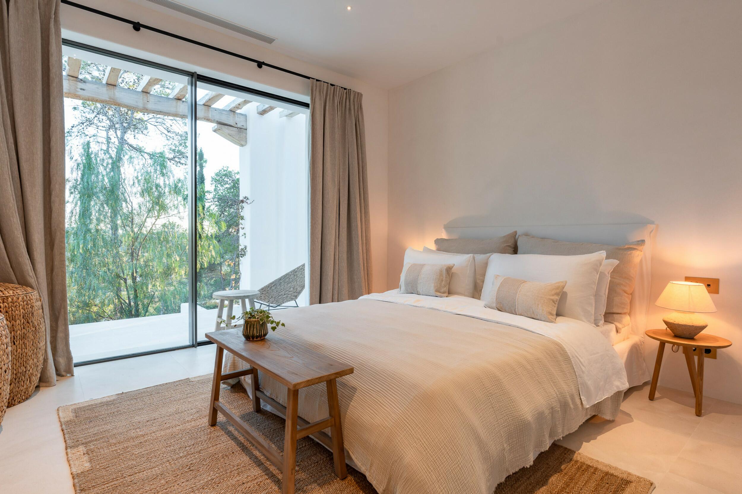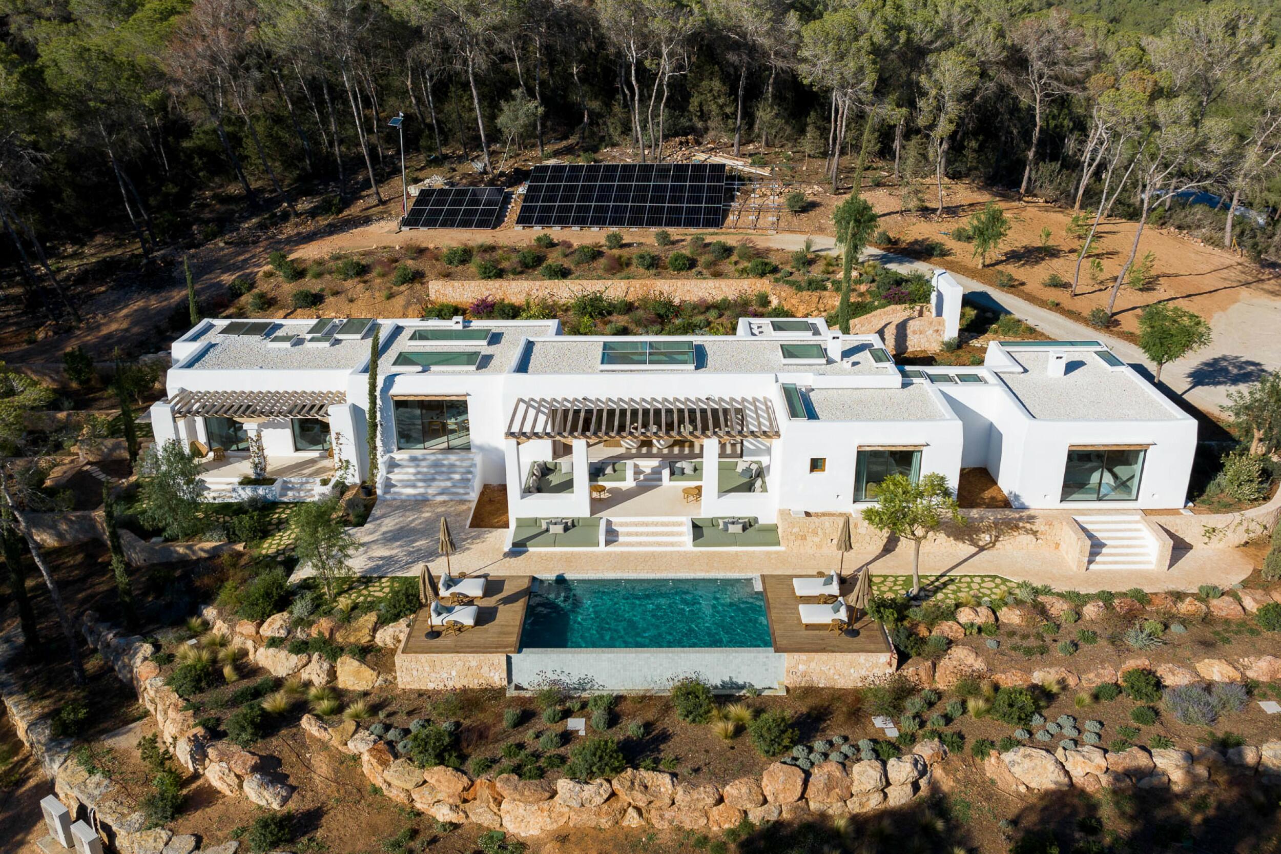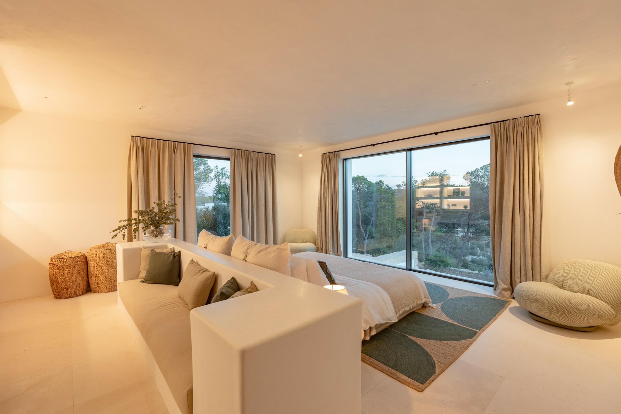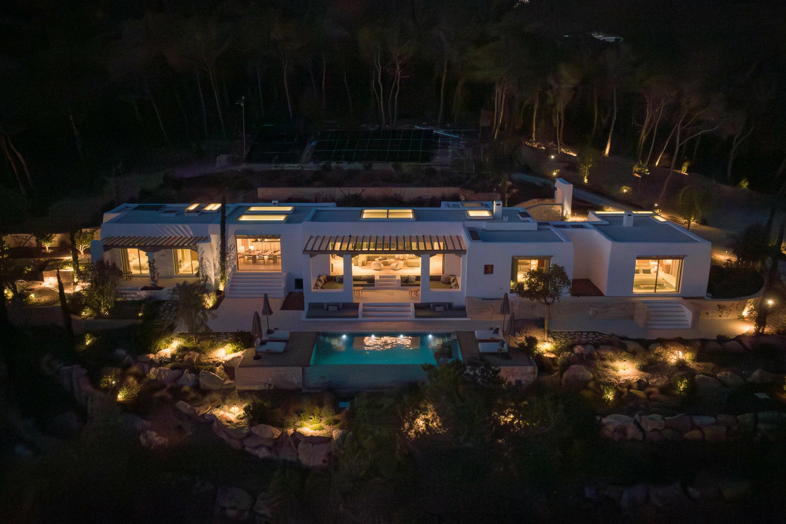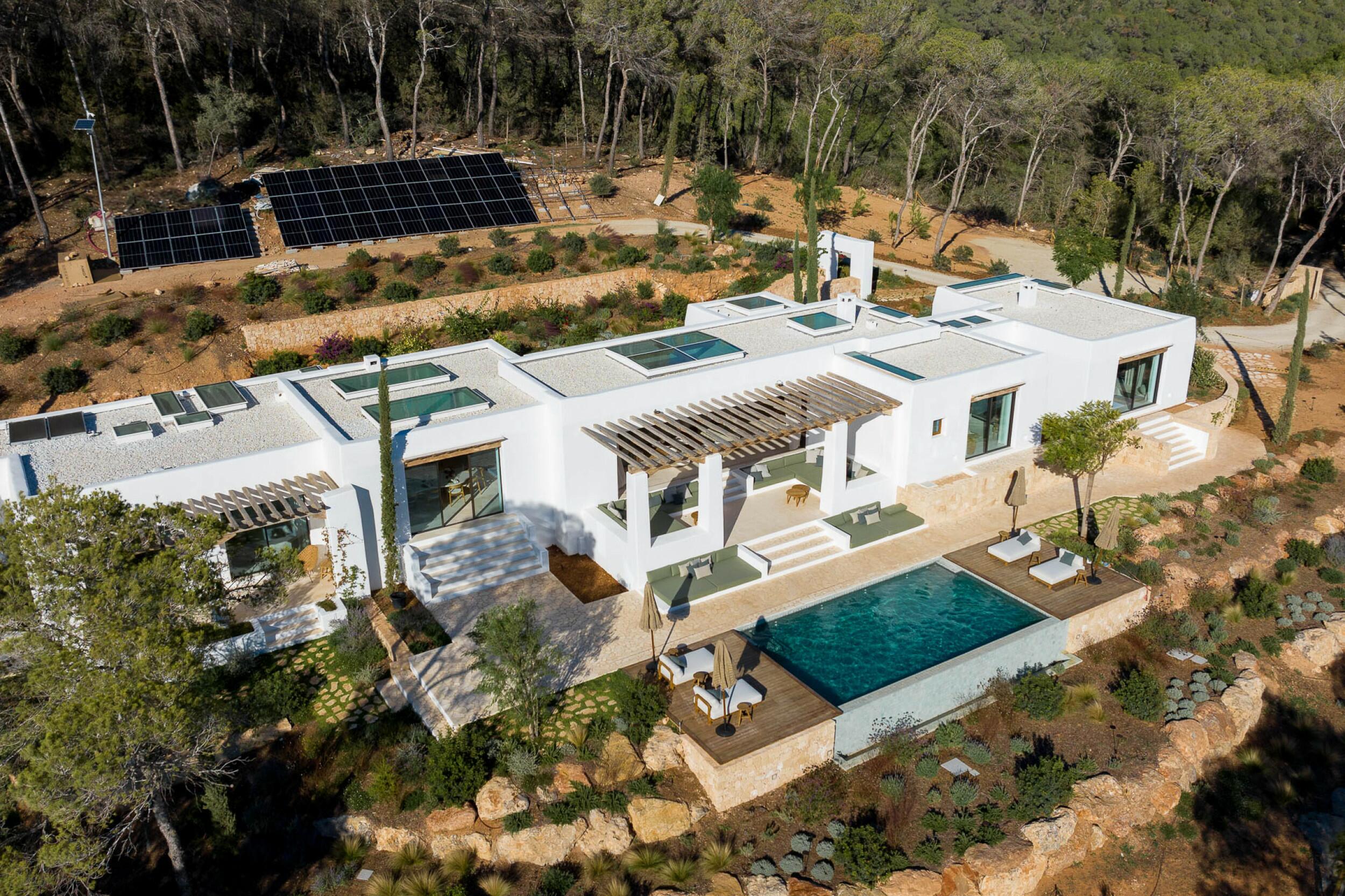 Esta propiedad muy especial, que tiene una superficie total de 32.000 m2 y una casa de 251 m2 tiene una hermosa e imponente fachada blanca de estilo campesino. Tradicionalmente, estas casas fueron construidas por los propios agricultores y ganaderos de Ibiza para vivir junto a sus tierras, y se distinguían por tener pequeñas ventanas de forma cuadrada y líneas curvas en los extremos de los tejados y las paredes.