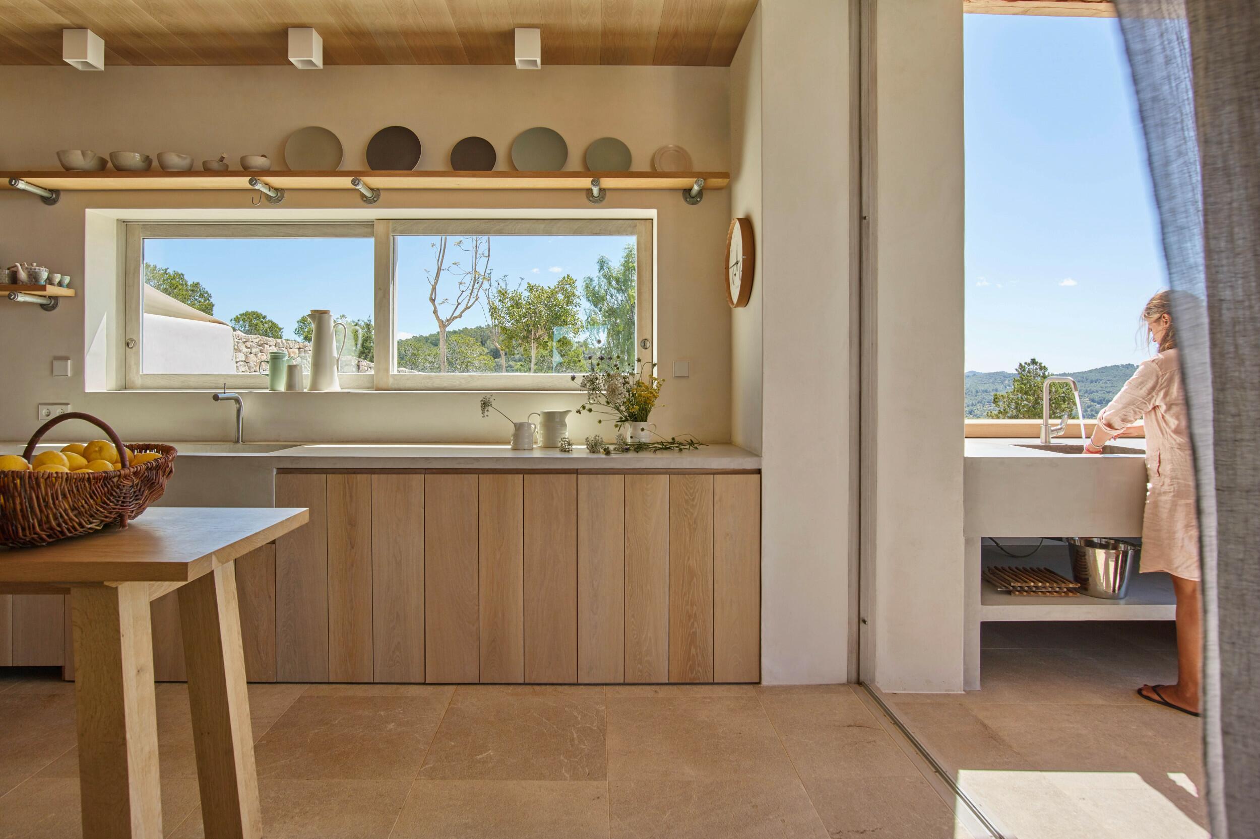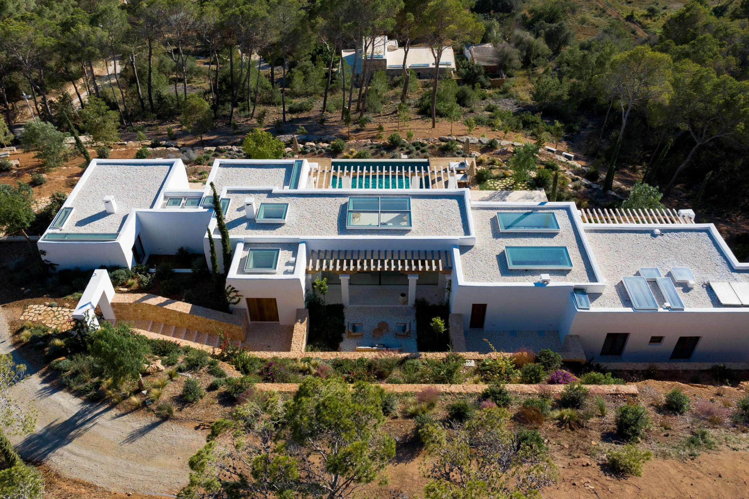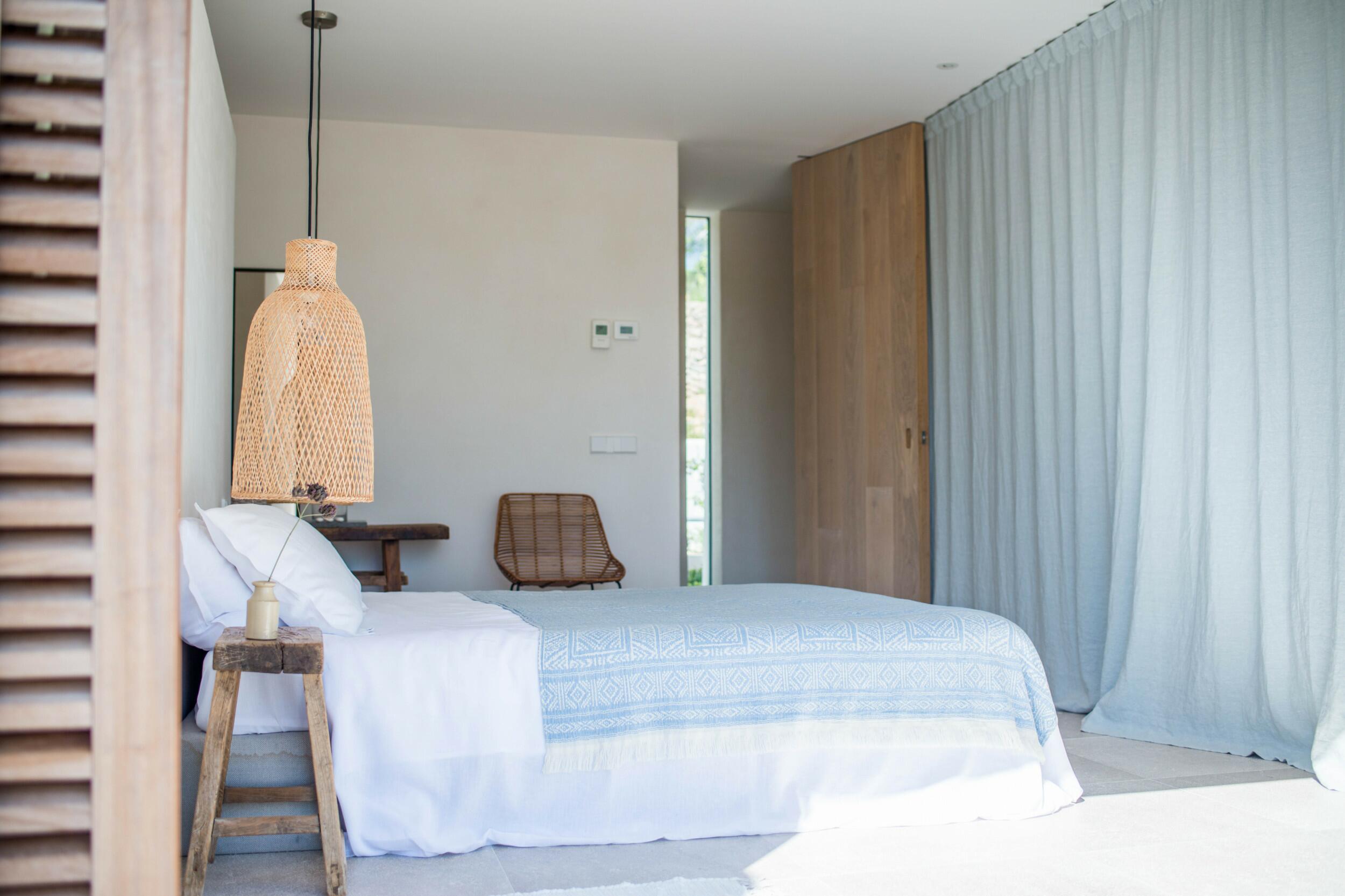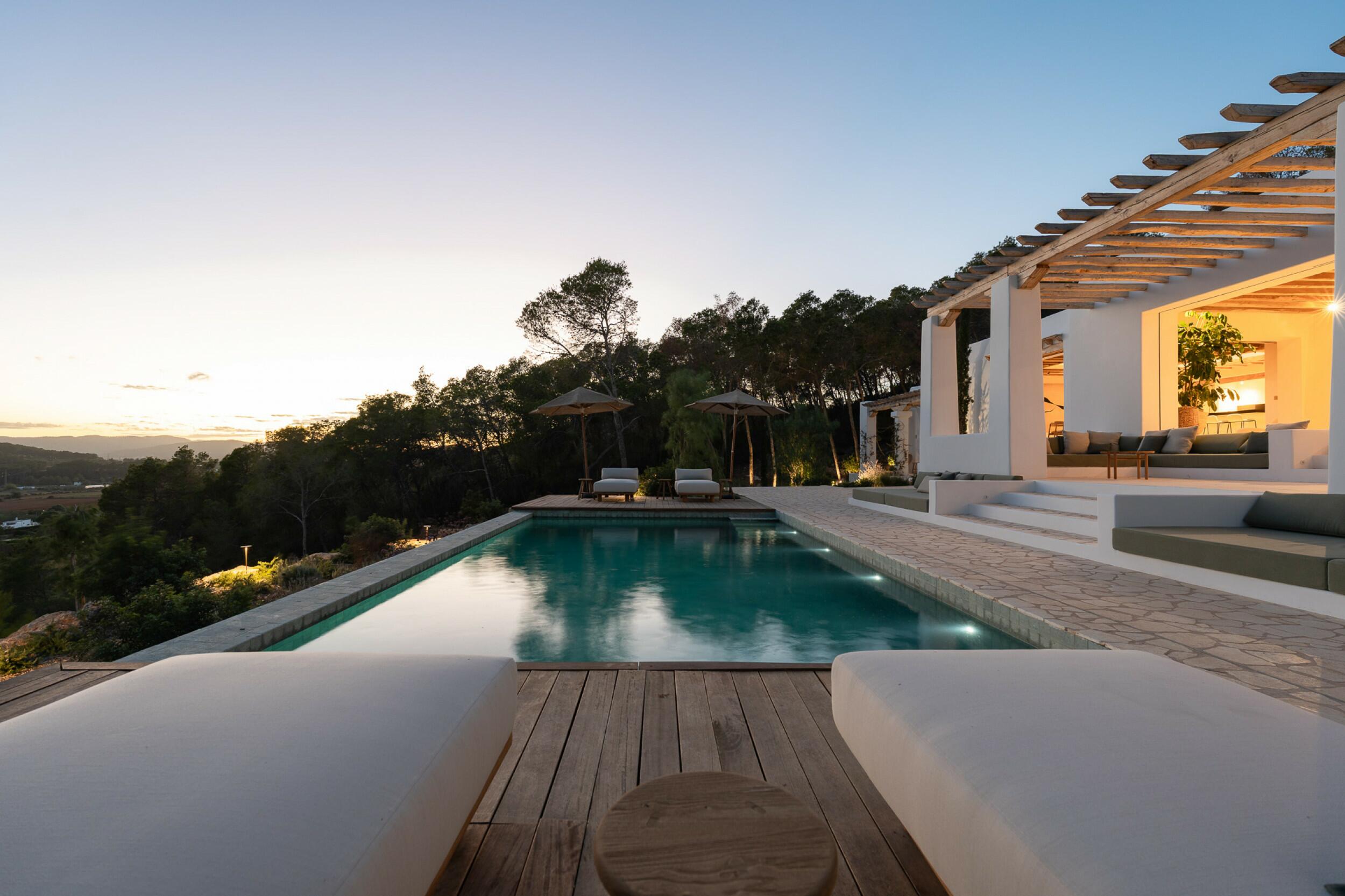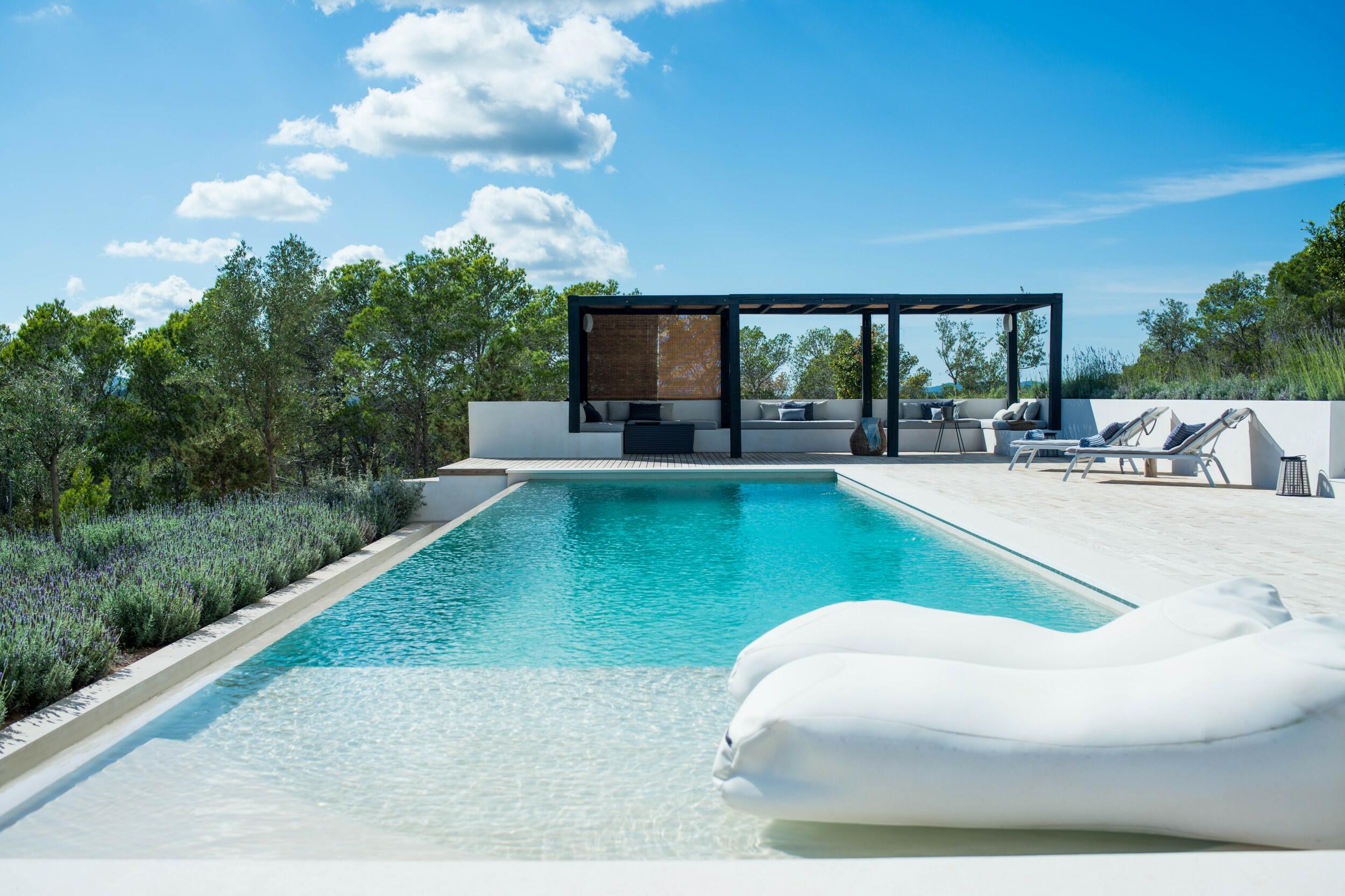 Esta propiedad muy especial, que tiene una superficie total de 32.000 m2 y una casa de 251 m2 tiene una hermosa e imponente fachada blanca de estilo campesino. Tradicionalmente, estas casas fueron construidas por los propios agricultores y ganaderos de Ibiza para vivir junto a sus tierras, y se distinguían por tener pequeñas ventanas de forma cuadrada y líneas curvas en los extremos de los tejados y las paredes.