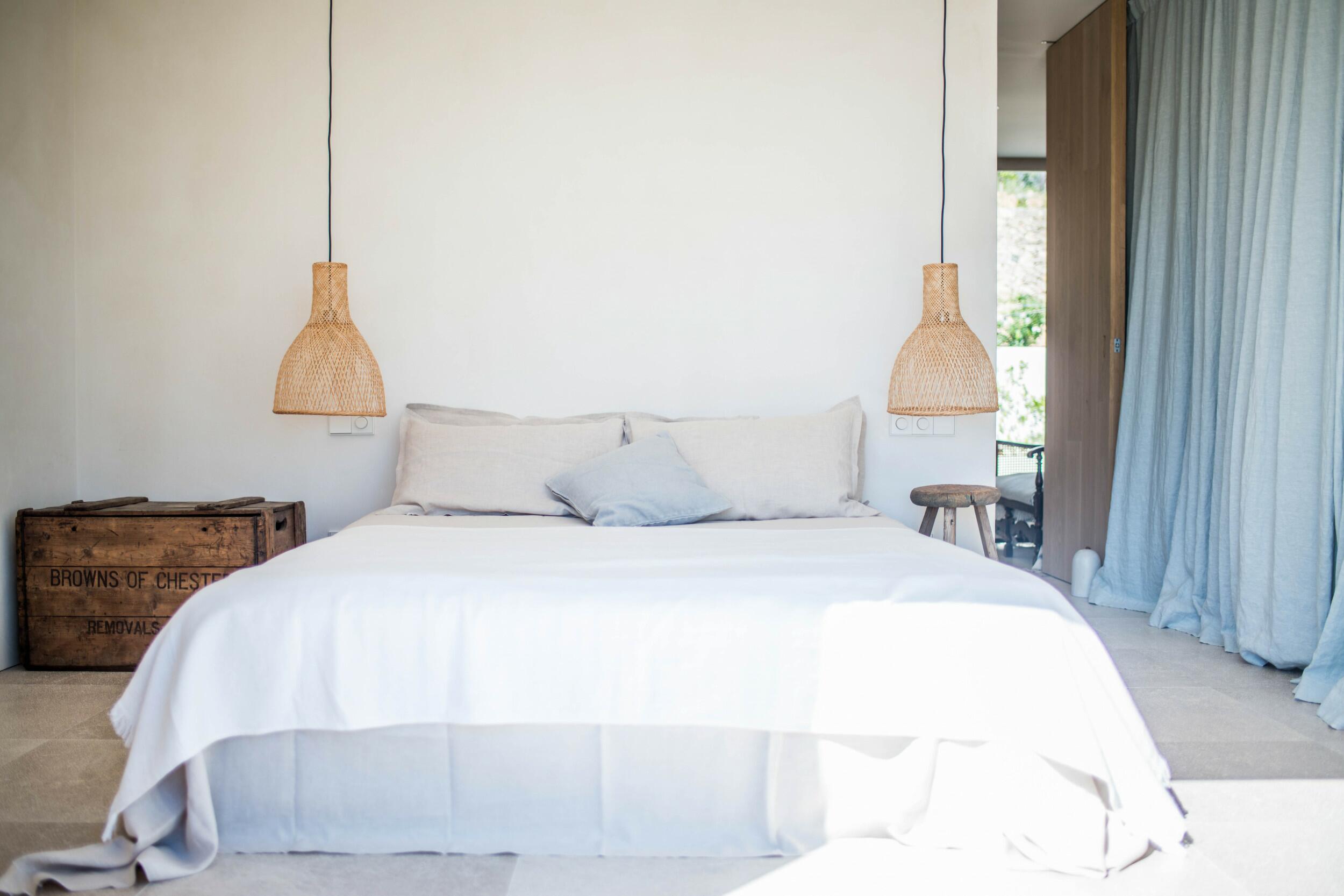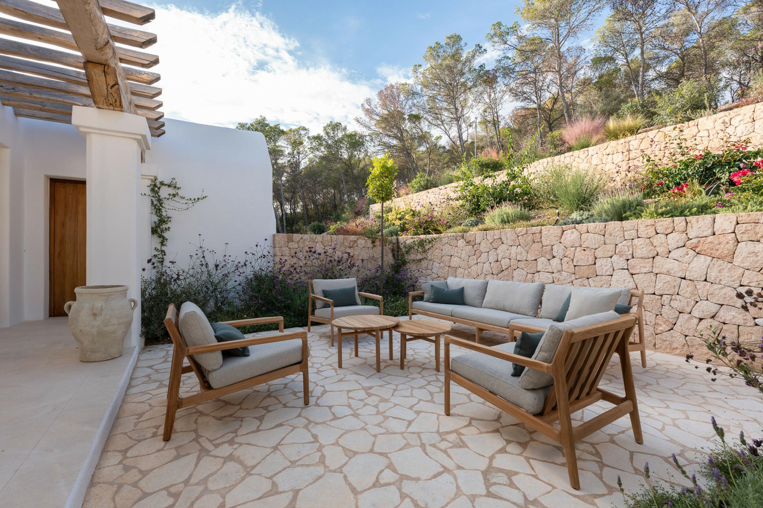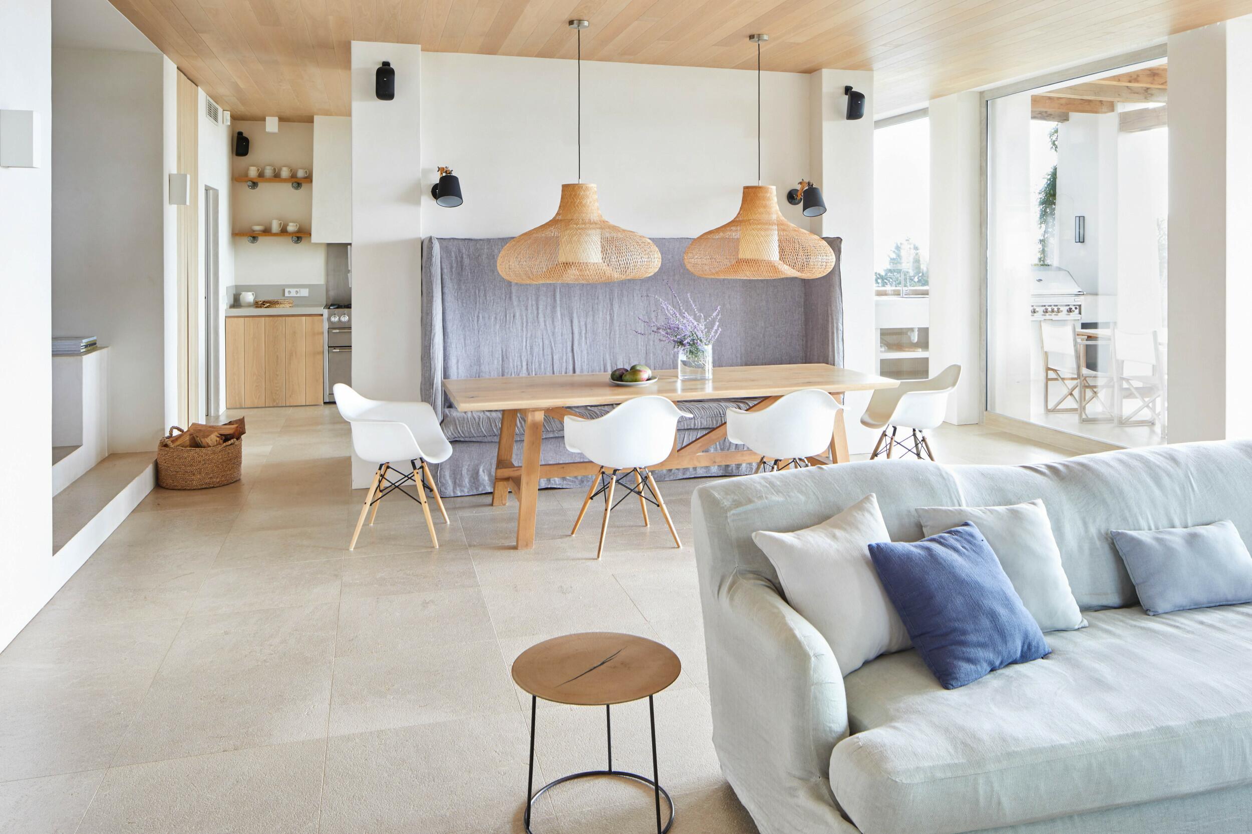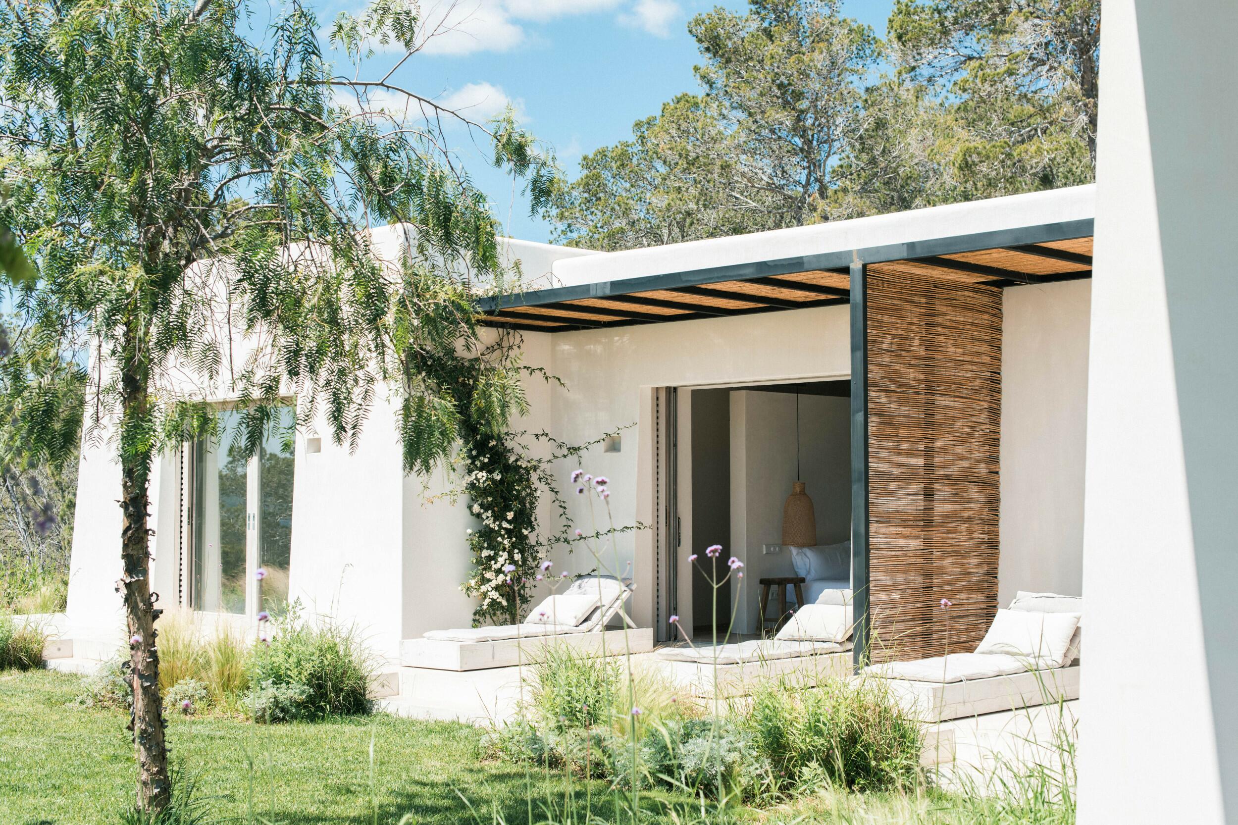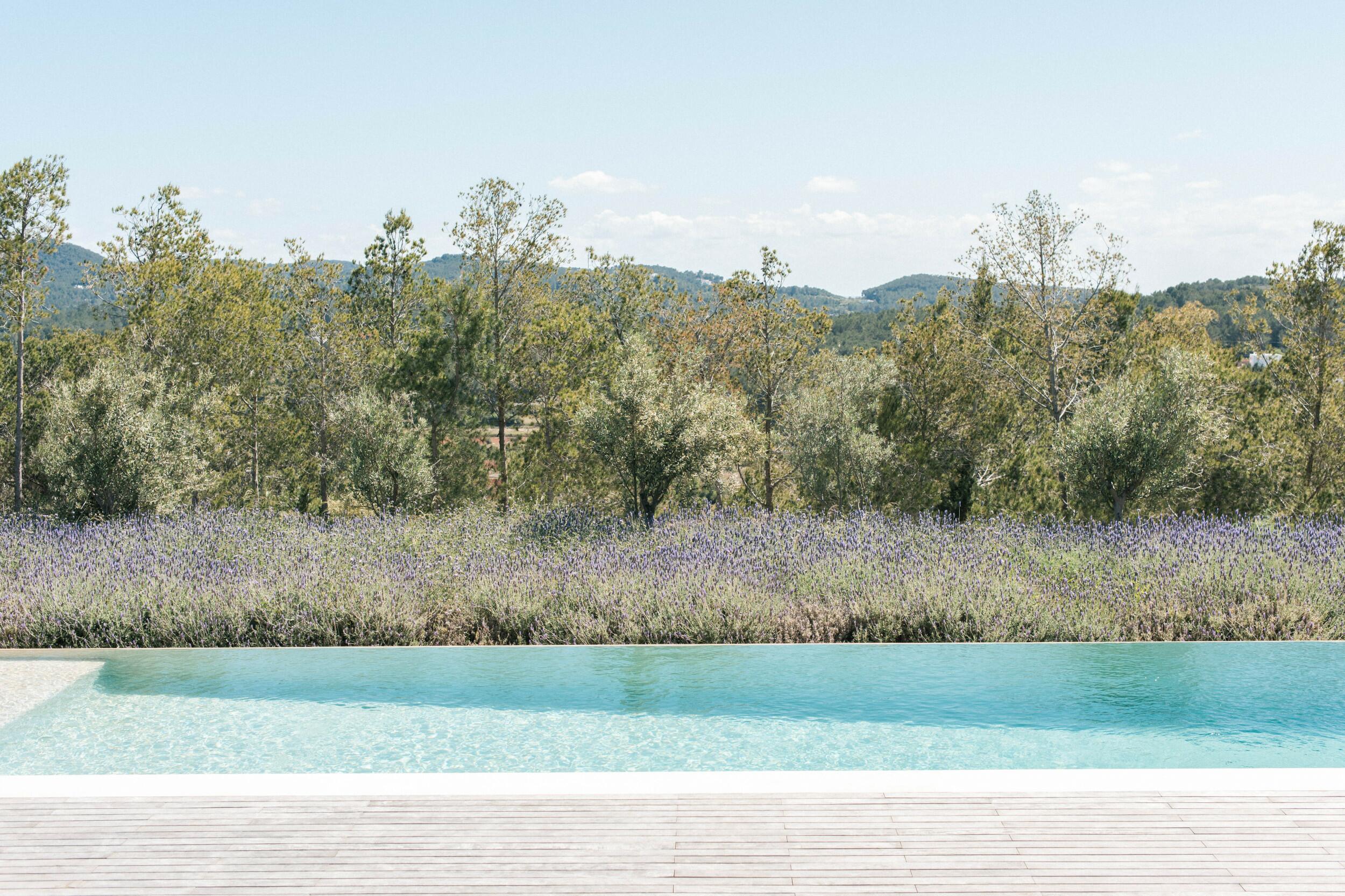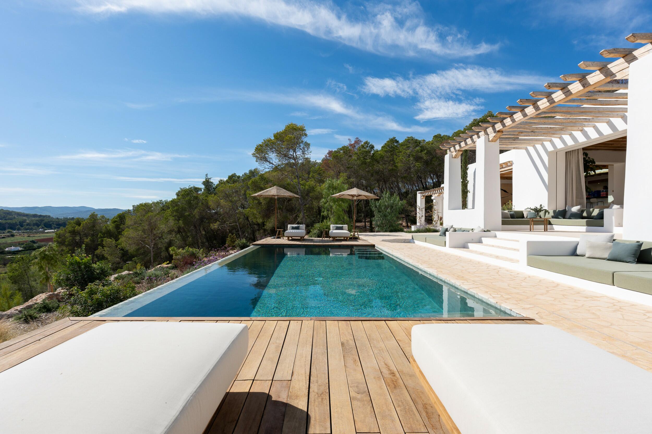 Esta propiedad muy especial, que tiene una superficie total de 32.000 m2 y una casa de 251 m2 tiene una hermosa e imponente fachada blanca de estilo campesino. Tradicionalmente, estas casas fueron construidas por los propios agricultores y ganaderos de Ibiza para vivir junto a sus tierras, y se distinguían por tener pequeñas ventanas de forma cuadrada y líneas curvas en los extremos de los tejados y las paredes.