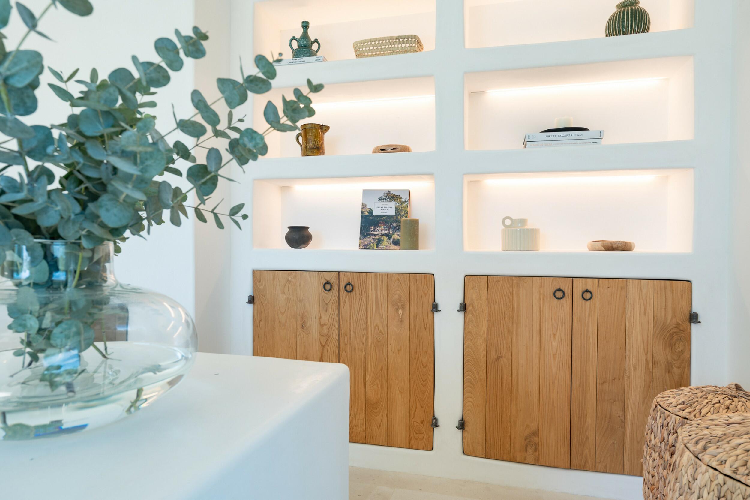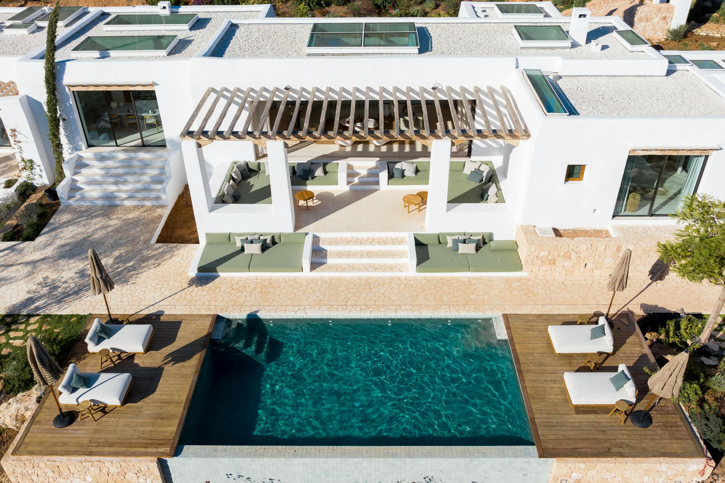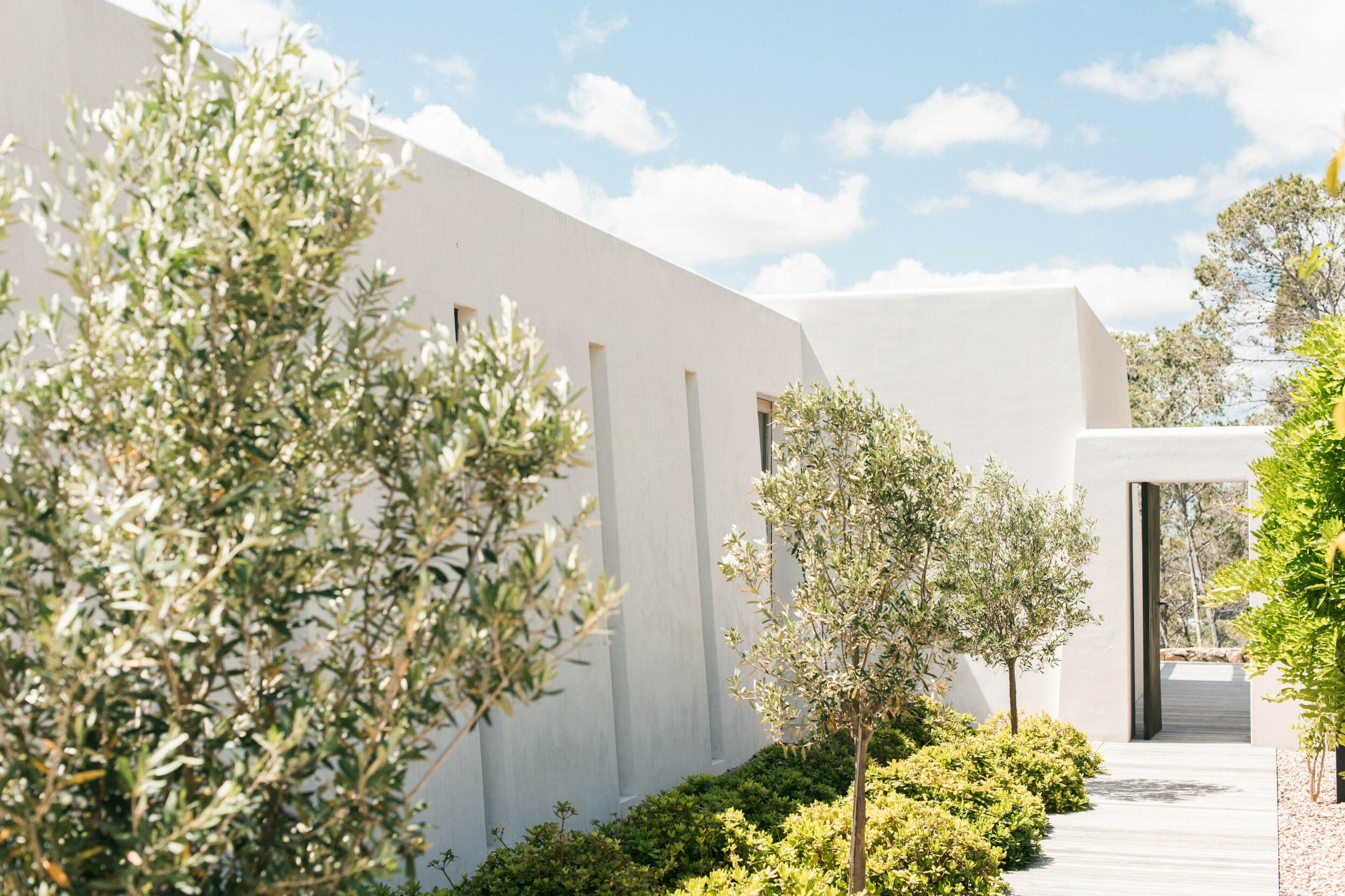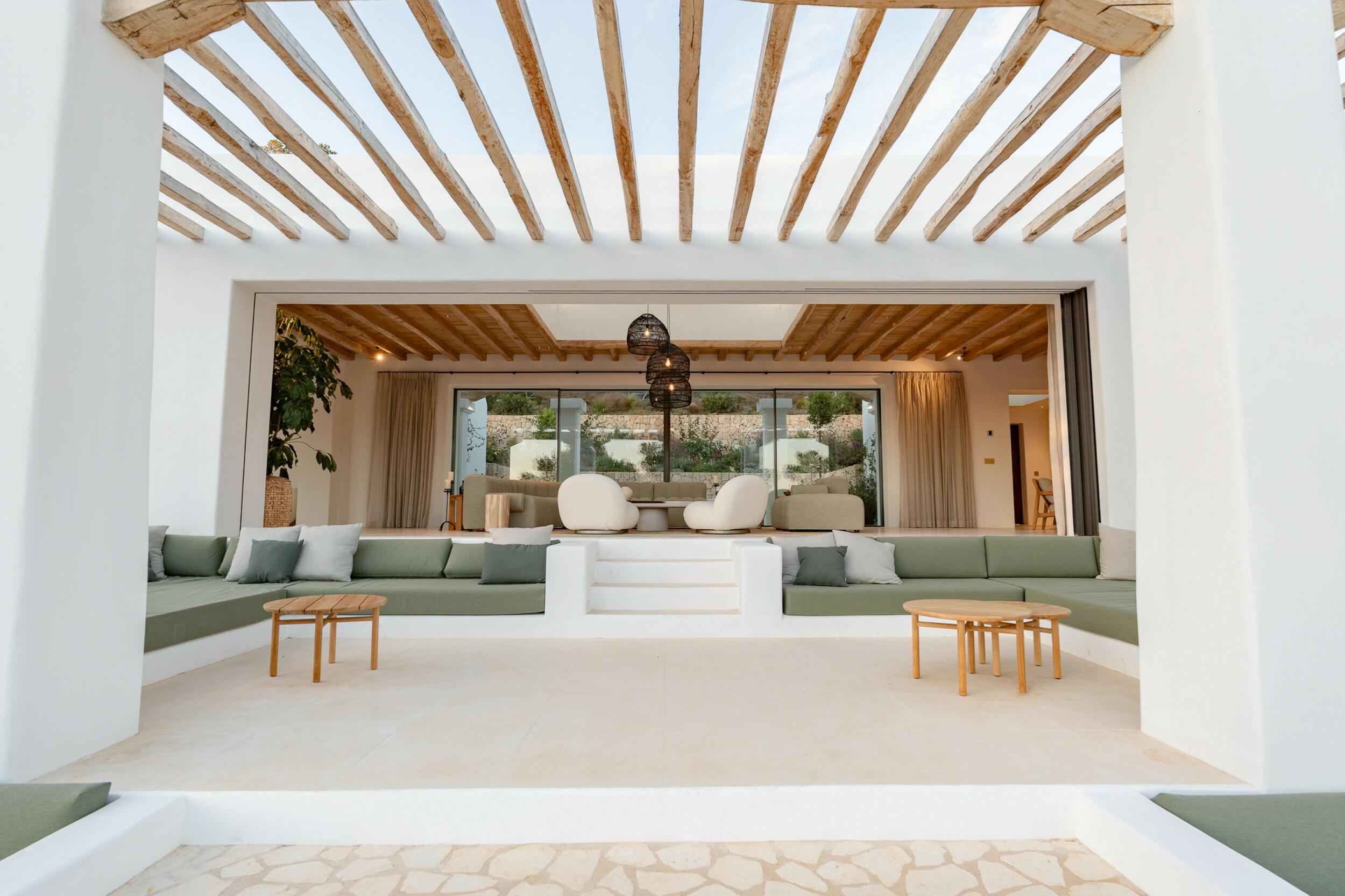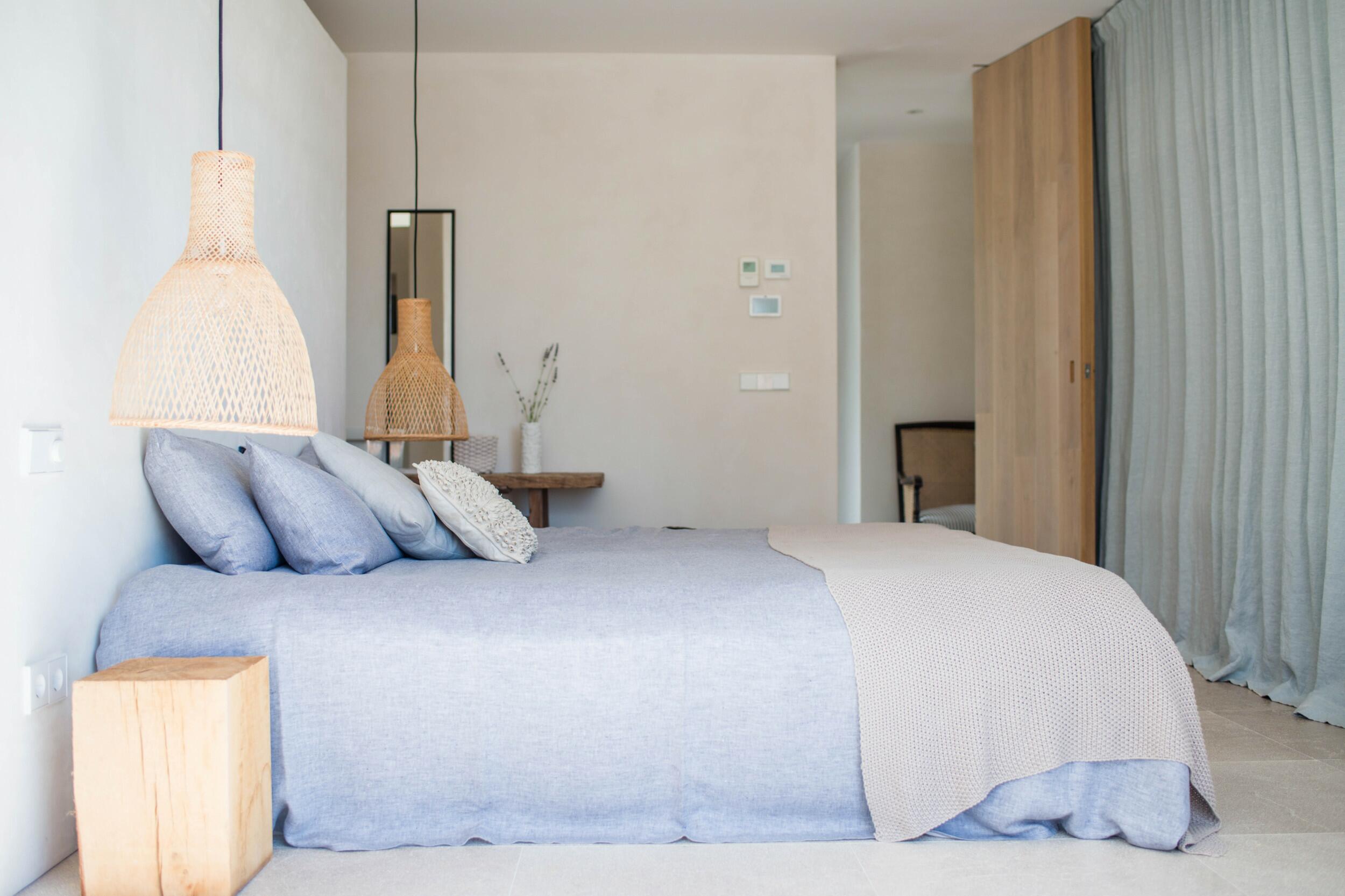 Esta propiedad muy especial, que tiene una superficie total de 32.000 m2 y una casa de 251 m2 tiene una hermosa e imponente fachada blanca de estilo campesino. Tradicionalmente, estas casas fueron construidas por los propios agricultores y ganaderos de Ibiza para vivir junto a sus tierras, y se distinguían por tener pequeñas ventanas de forma cuadrada y líneas curvas en los extremos de los tejados y las paredes.