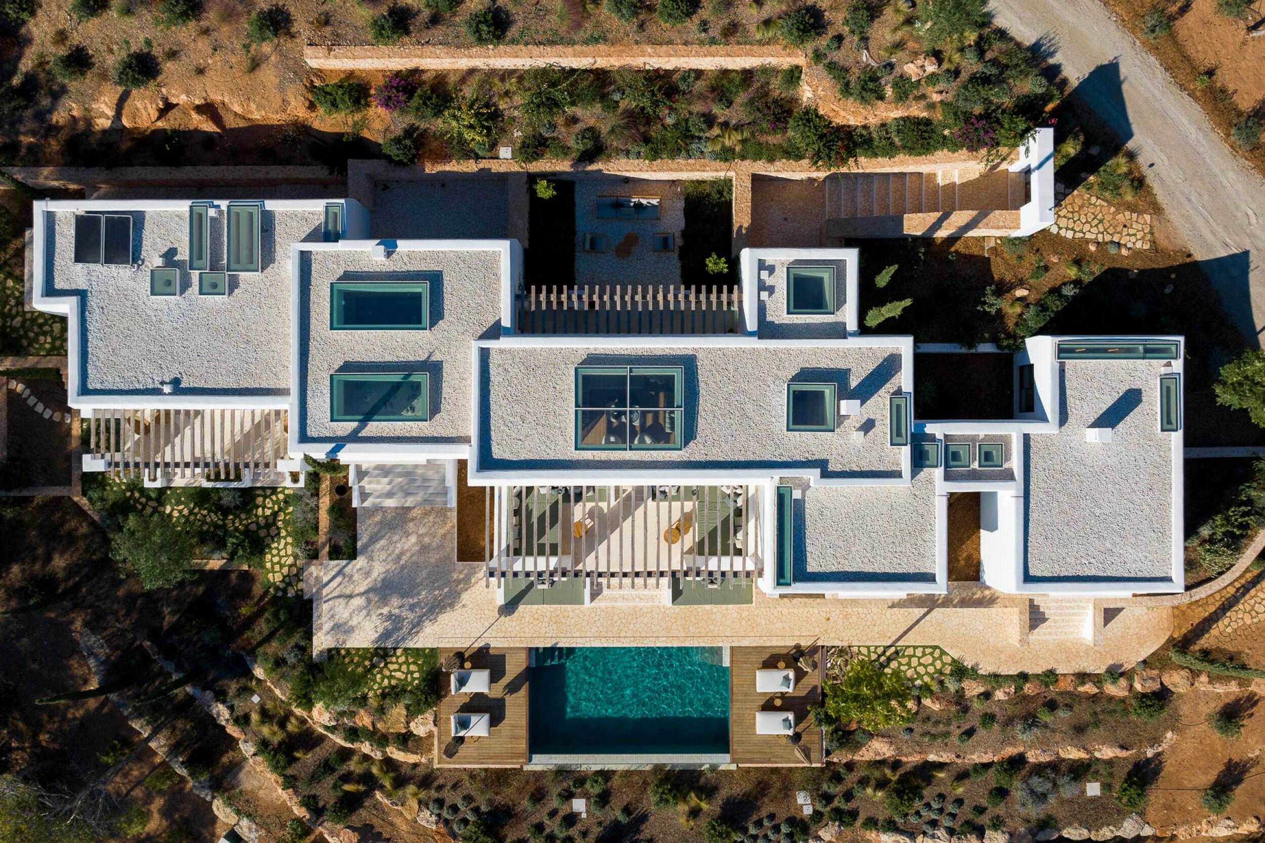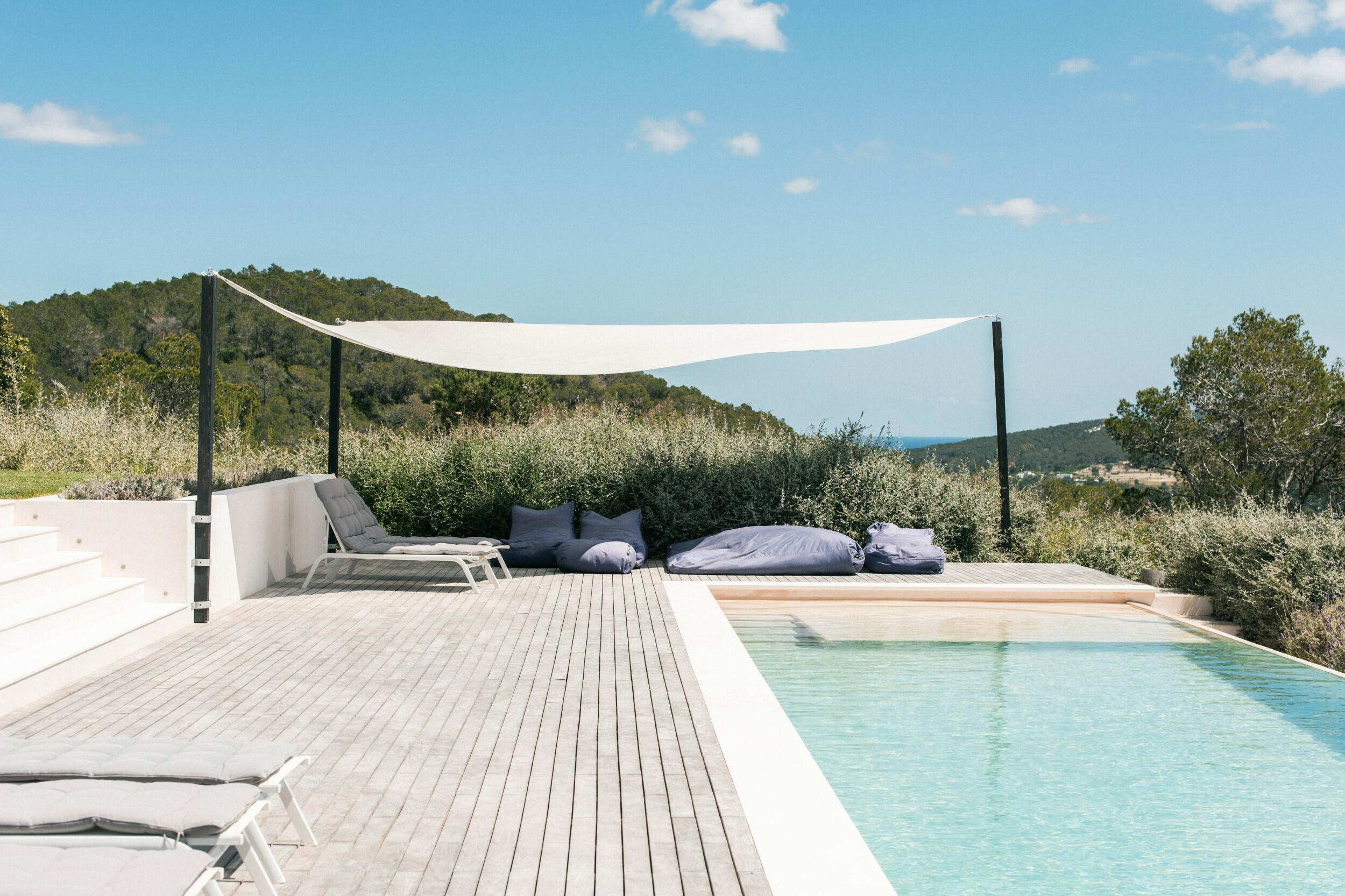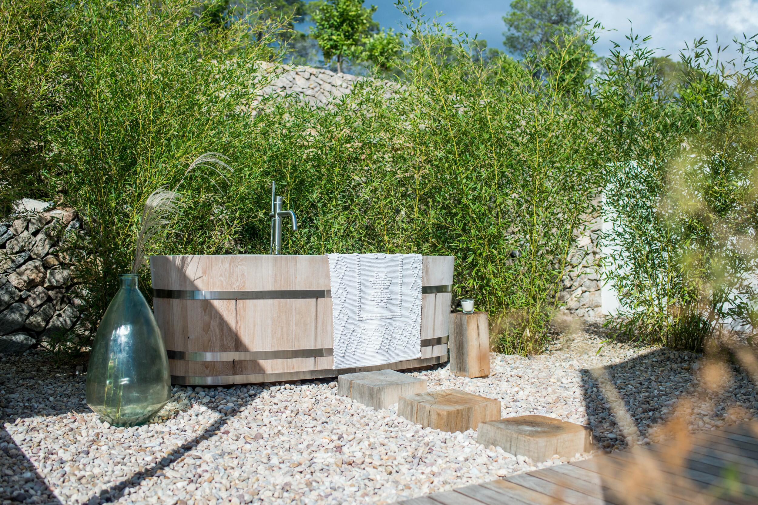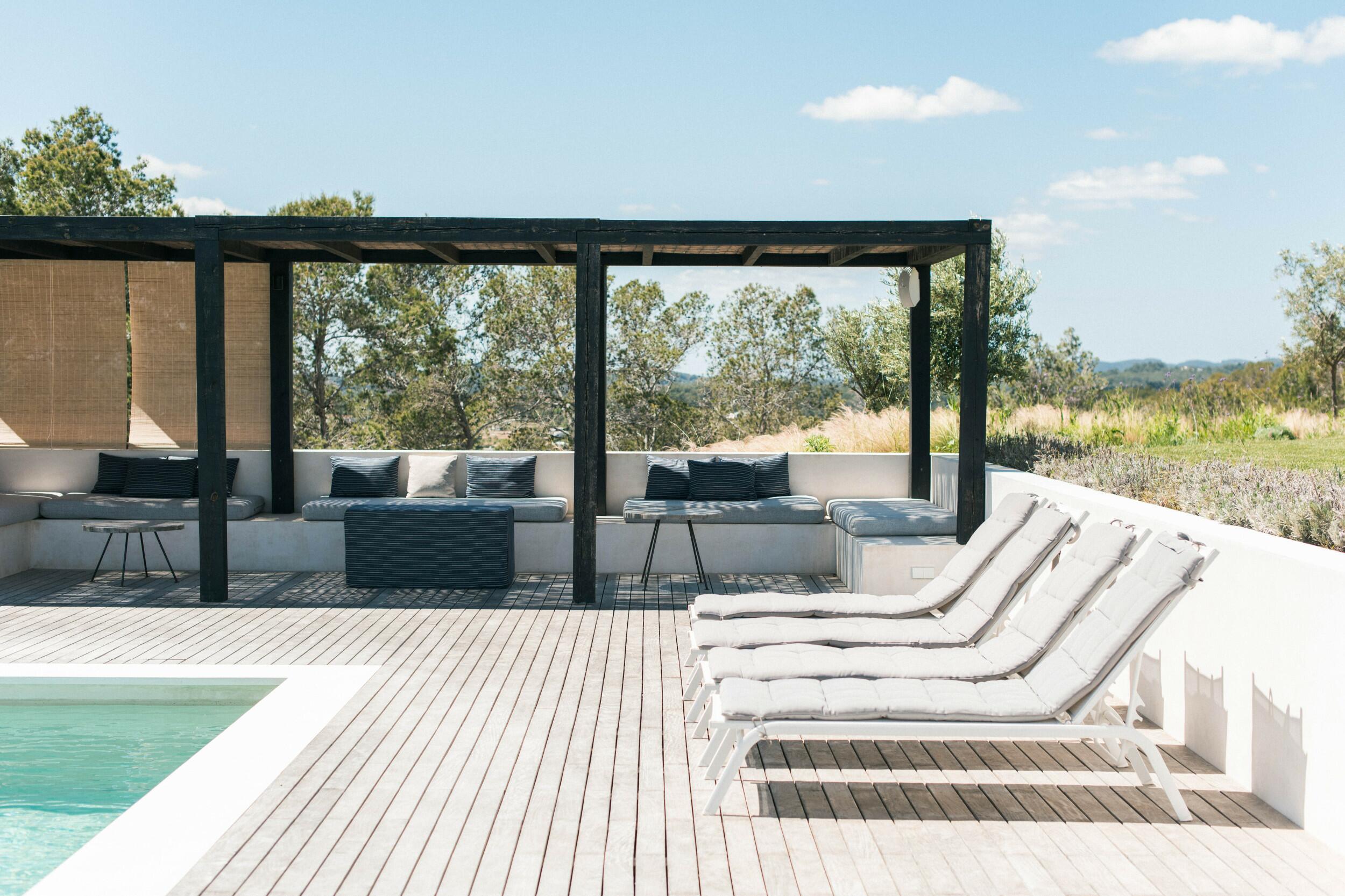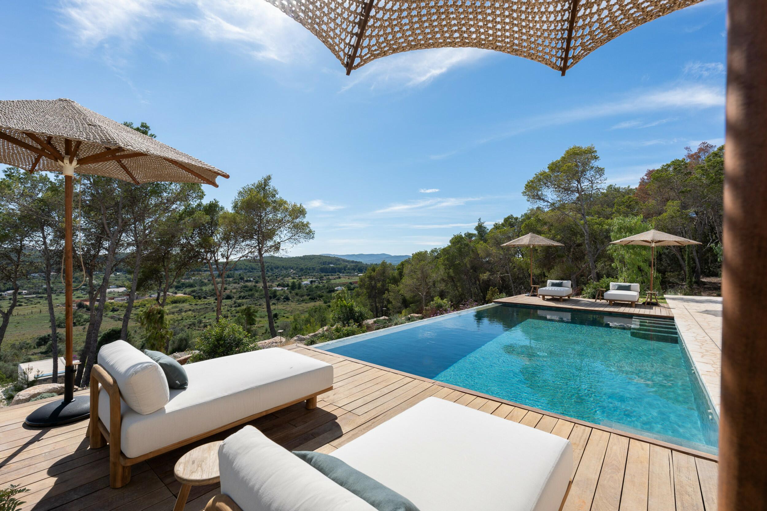 Esta propiedad muy especial, que tiene una superficie total de 32.000 m2 y una casa de 251 m2 tiene una hermosa e imponente fachada blanca de estilo campesino. Tradicionalmente, estas casas fueron construidas por los propios agricultores y ganaderos de Ibiza para vivir junto a sus tierras, y se distinguían por tener pequeñas ventanas de forma cuadrada y líneas curvas en los extremos de los tejados y las paredes.